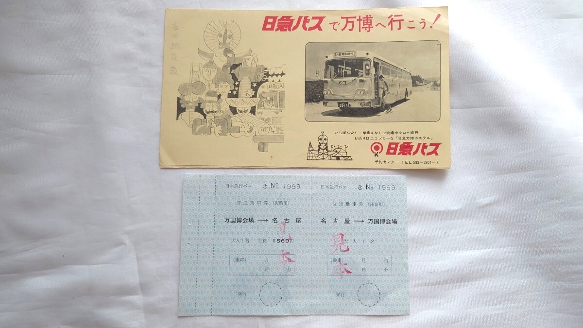 ▼日本急行バス・見本▼名古屋→万国博会場 往復乗車券軟券▼EXPO'70大阪万博