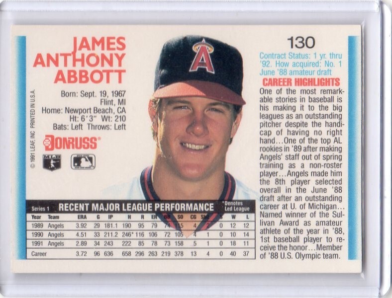 1992DONRUSS #130 ----------------------------------------------------------- ■ジム・アボット MLB成績 10年 1989-96/98-99 エンゼルス ヤンキース Wソックス ブルワーズ 263試合 87勝108敗 1674回 888奪三振 防御率4.25 新人王 1991年 18勝 防御率2.89(共にリーグ4位) 1993/9/4 ノーヒッター達成 (ヤンキース時代 インディアンズ戦) アボット・ファンの方、是非どうぞ! |