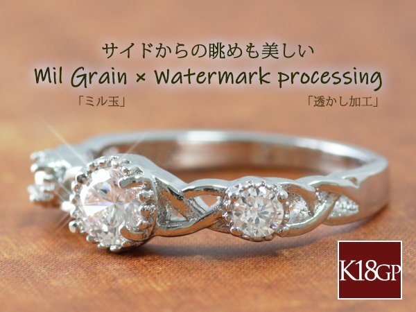13号 / 新品 指輪 K18GP ミル打ち 透かし リング レディース シルバー 18金 ホワイトゴールド ダイヤ CZ シンプル おしゃれ プレゼント 女