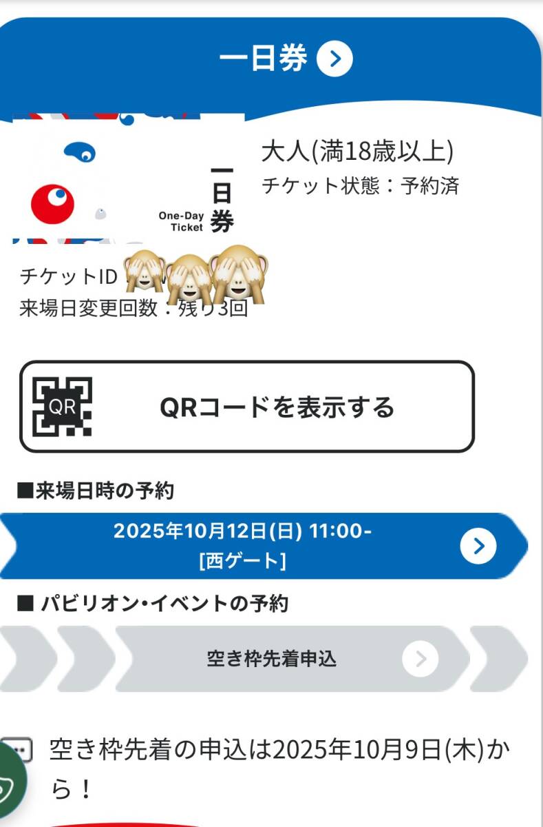 ご入金確認後、取引メッセージにて電子チケットの受取URLをお知らせしますので、ご自身の万博IDに紐付け追加登録をして下さい。