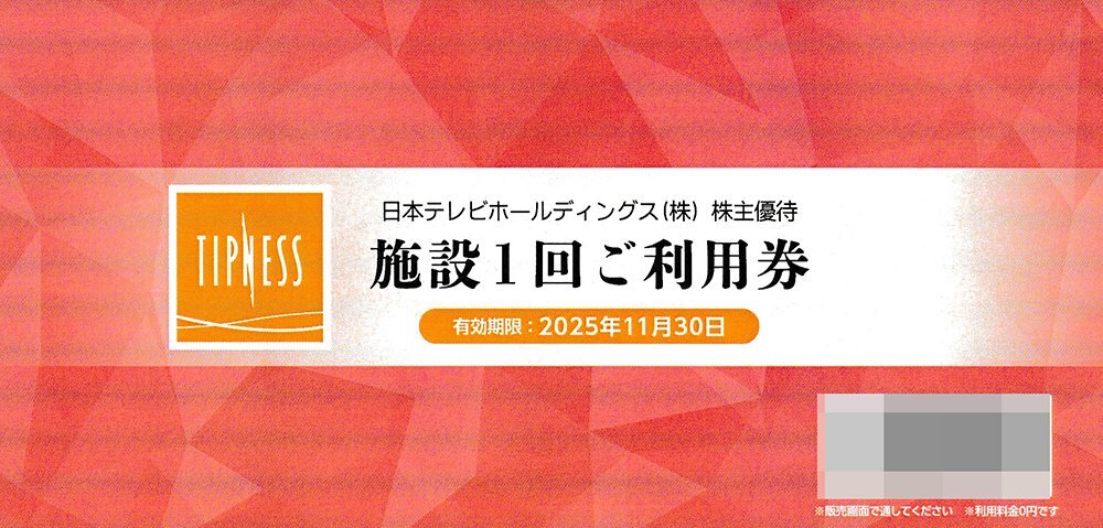 | 出 品 商 品 | 日本テレビホールディングス 株主優待券 施設1回ご利用券 1枚 |