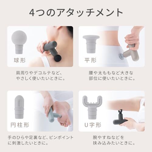 【4種類のアタッチメント】本製品は、球形・平形・円柱形・U字形の4つのアタッチメントがついています。球形は肩回りやデコルテなど、やさしく使いたいたいときに使い、球形は腰や太ももなどに大きな部位に、円柱形は手のひらや足裏などピンポイントに刺激したいときに、U字形は腕やすねなど挟み込みたいときに使うのがおすすめです。