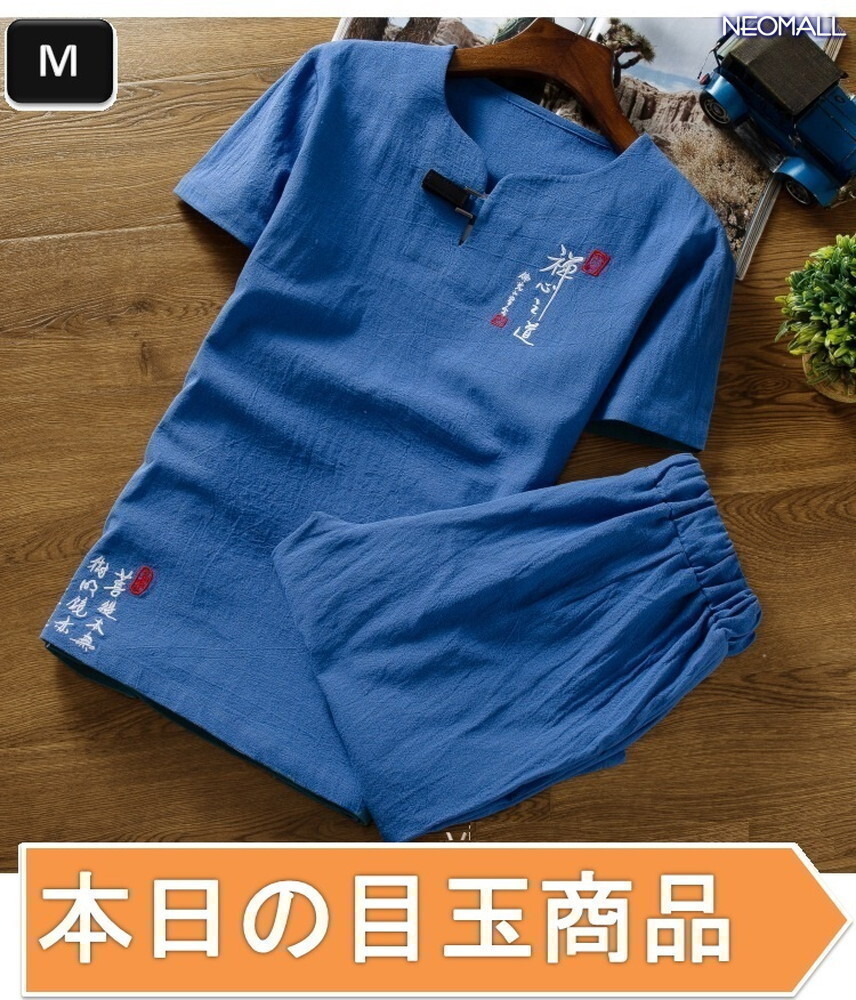 1スタ☆【299】 新品 サマーコットン ヘンリーネック セットアップ ブルー Mサイズ 春 夏 部屋着 ルームウエア