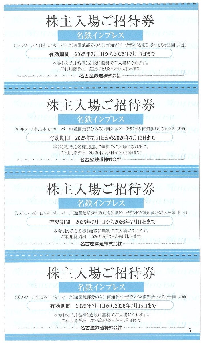 ◎C 即決あり: 日本モンキーパーク・リトルワールド・南知多ビーチランド 4枚セット 名鉄株主優待 2026.7.15迄 普通郵便無料 施設利用券