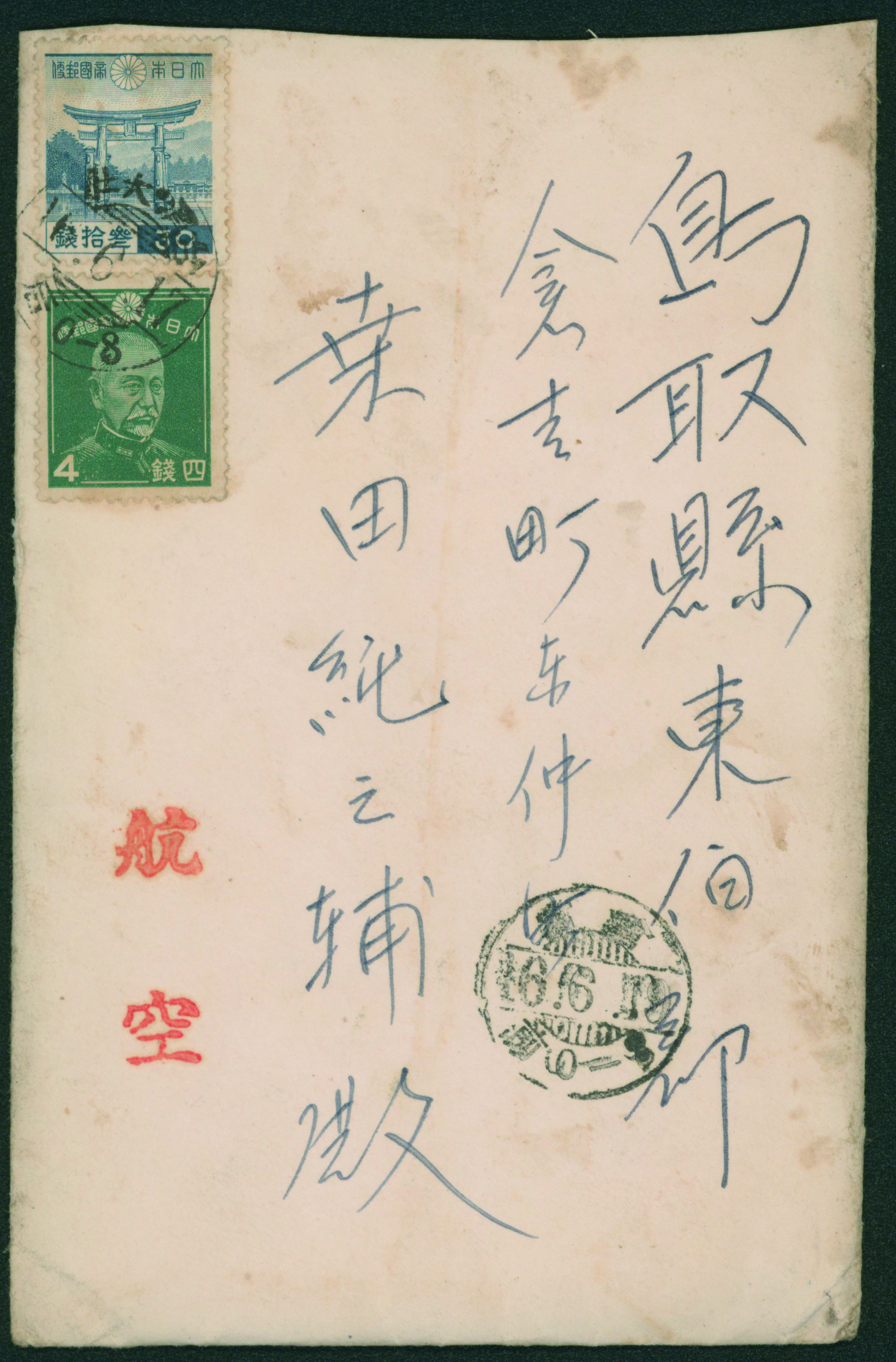 商品説明: 厳島30銭, 東郷4銭 櫛型印 昭和16 6 17 台湾・大甲(台湾)→鳥取県 到着印:倉吉 昭和16 6 19 書状航空 カバー汚れ 中身入り JPS 235,225