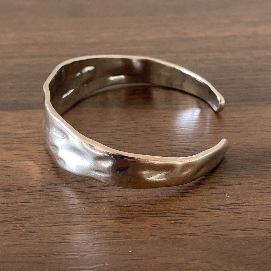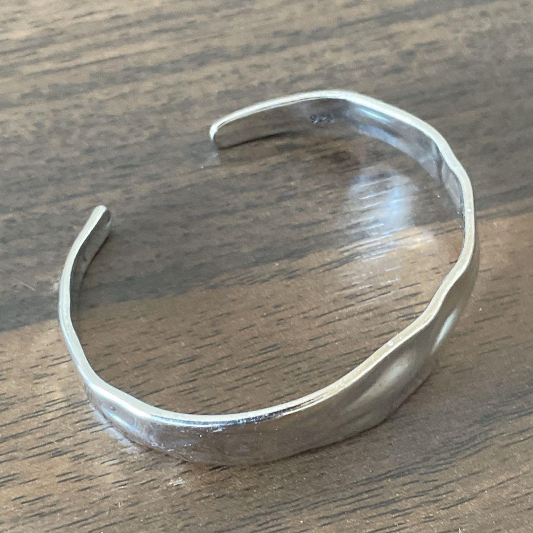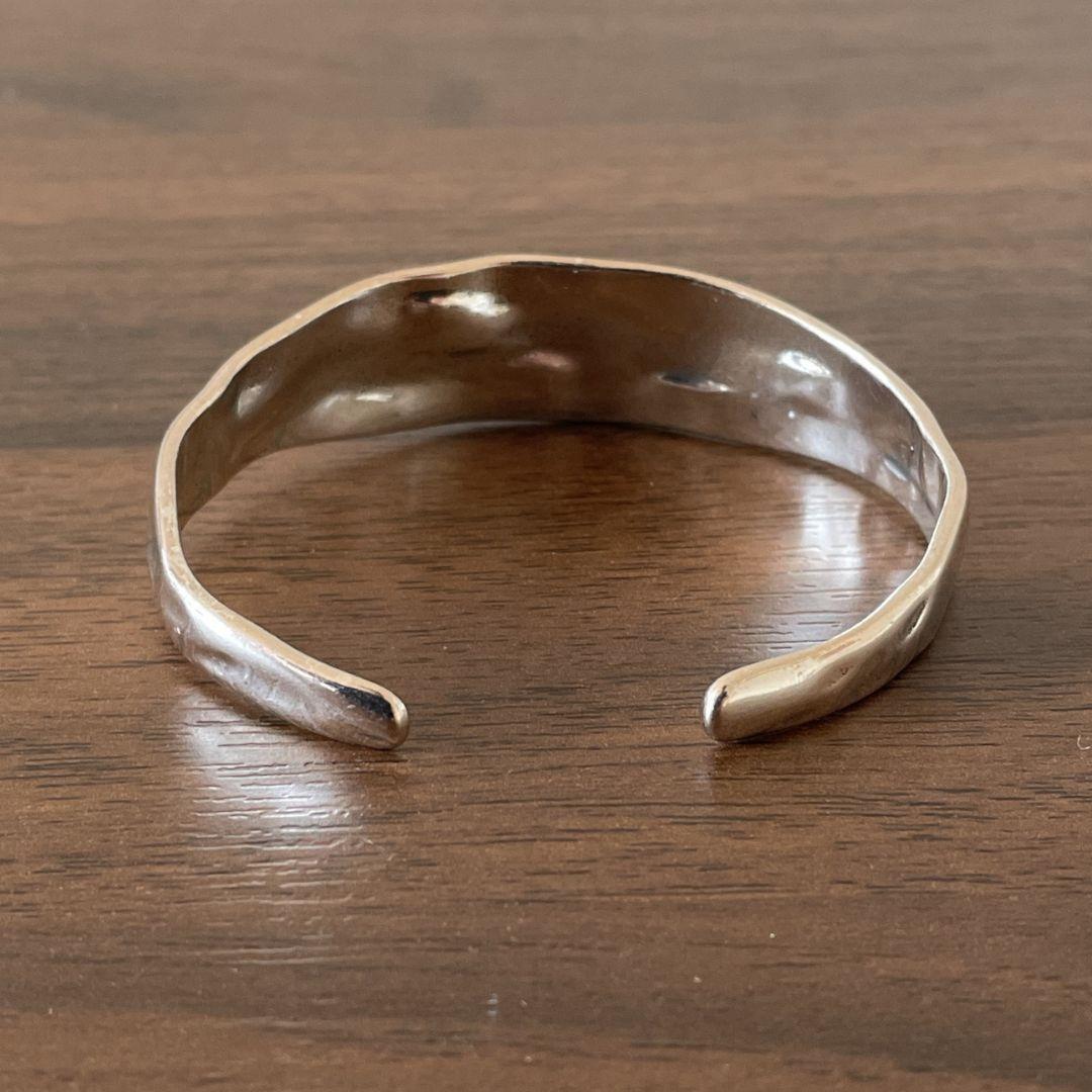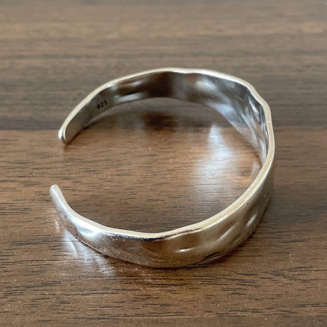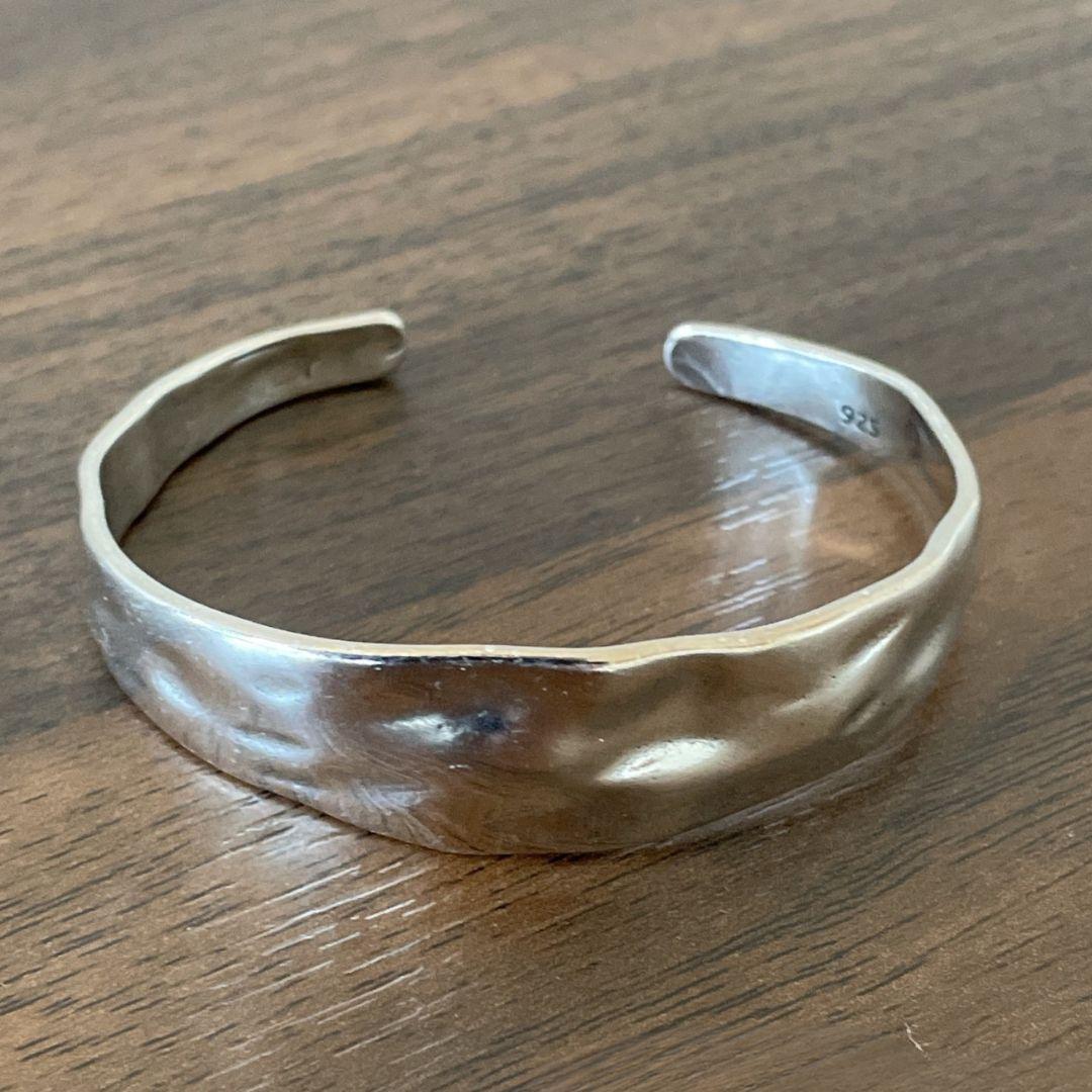 無垢のシルバーを丁寧に叩き上げ、シンプルながらも力強い存在感を放つプレーンなデザイン。光の反射で生まれる独特の陰影が、手元に深みと個性をプラスします。