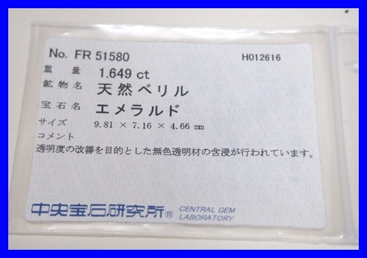 エメラルド1.649ct(ソーティング付き)、ダイヤモンド1.02ct。