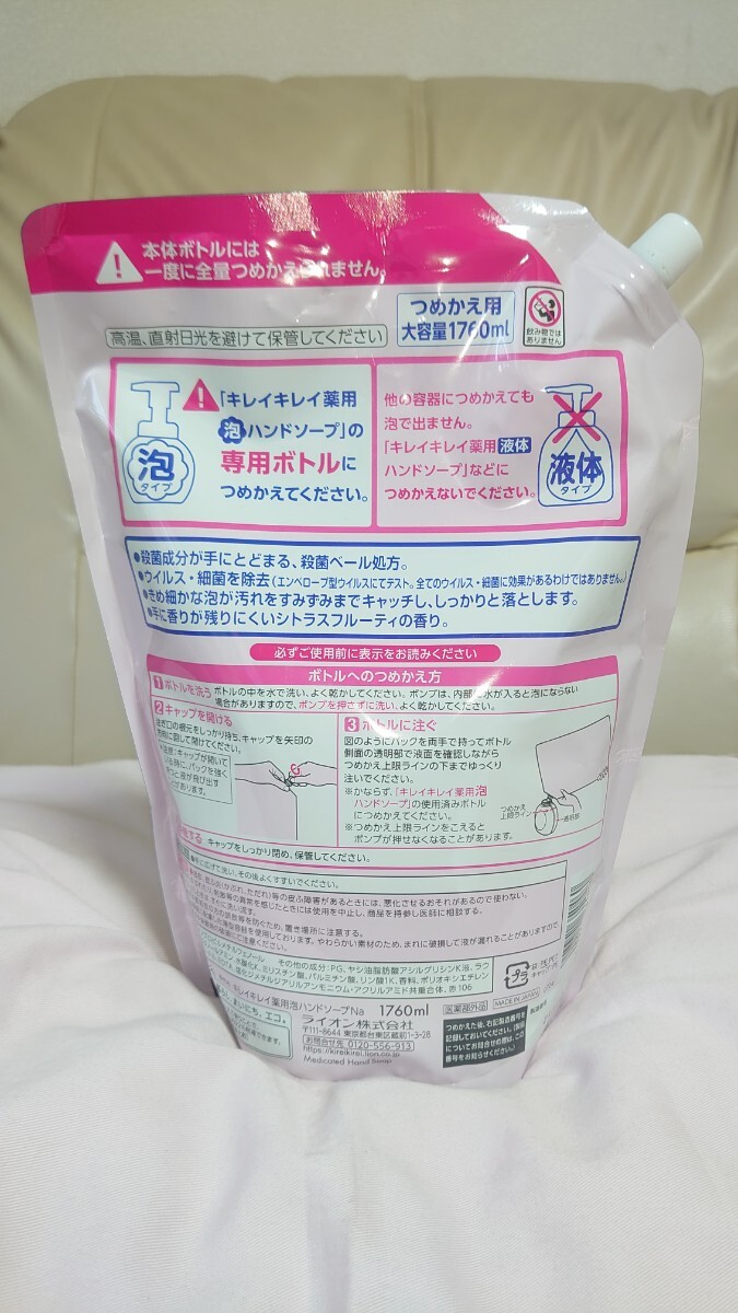 ●殺菌成分が手にとどまる、殺菌ベール処方。 ●ウイルス・細菌を除去(エンベロープ型ウイルスにてテスト。全てのウイルス・細菌に効果があるわけではありません)。 ●菌を増やさない抗菌ボトル・ポンプヘッド採用。(抗菌ボトル・ポンプヘッドは全ての菌に有効ではありません。清潔に保ってください。) ●手に香りが残りにくいシトラスフルーティの香り。 ●1760mlのつめかえ用大容量サイズ。 キレイキレイ 薬用 泡ハンドソープ シトラスフルーティの香り 詰め替え 大容量サイズ 1760ml [医薬部外品] 殺菌