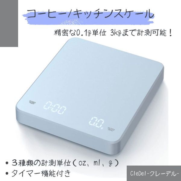 コーヒースケール デジタルスケール キッチンスケール 0.1g単位 3kg タイマー機能 自動OFF IPX4防水 耐熱 USB充電 アイスブルー gg0013-bl