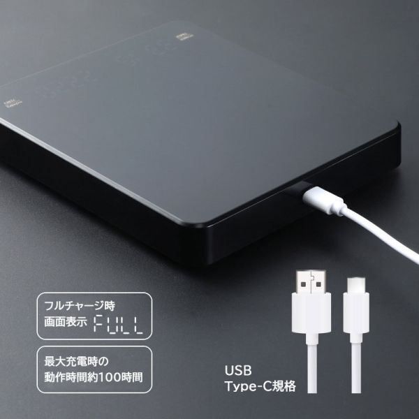 135℃の高温に耐え、表面には防水加工がされています。USB Type-Cで充電可能で最大充電時約100時間動作し、3分間の操作がなかった場合に自動で電源が切れるので、バッテリー消費が抑えられます。