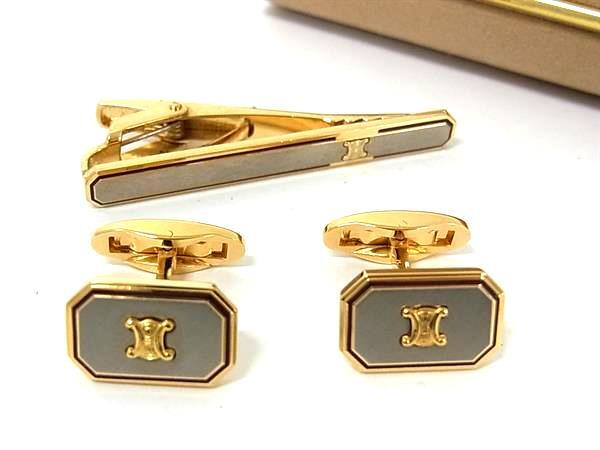 ■美品■ CELINE セリーヌ マカダム カフスボタン カフリンクス ネクタイピン アクセサリー 2点セット ゴールド系×シルバー系 DH0488