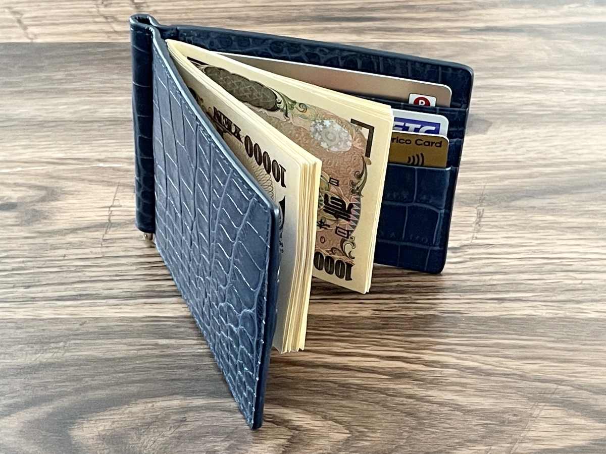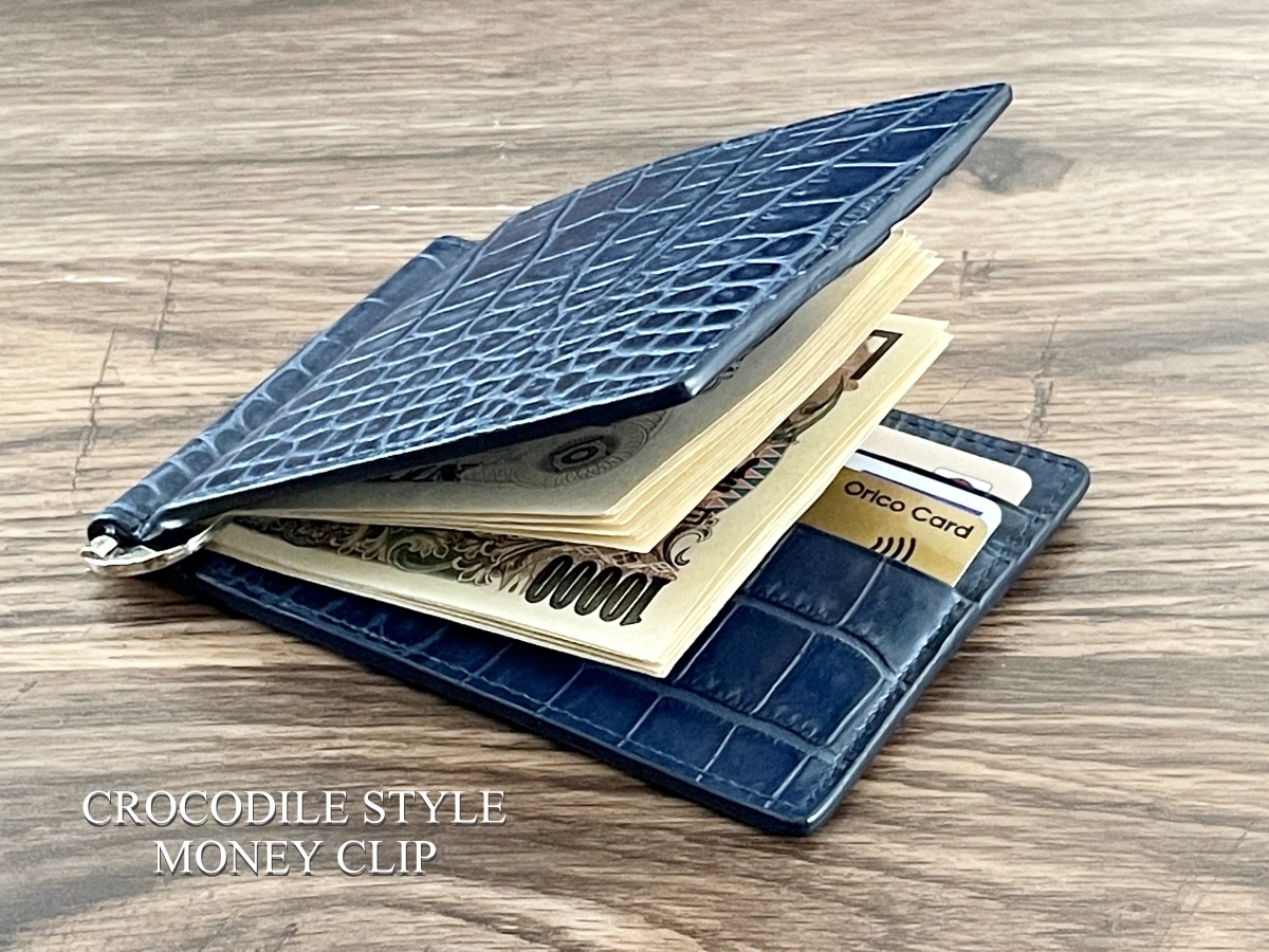 【新品 送料無料】クロコダイル 型押し 無双 マネークリップ ネイビー 財布 札ばさみ 薄型 スリム 革 札入れ 二つ折り 牛革 本革
