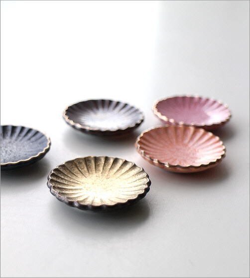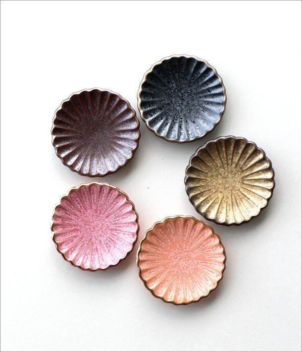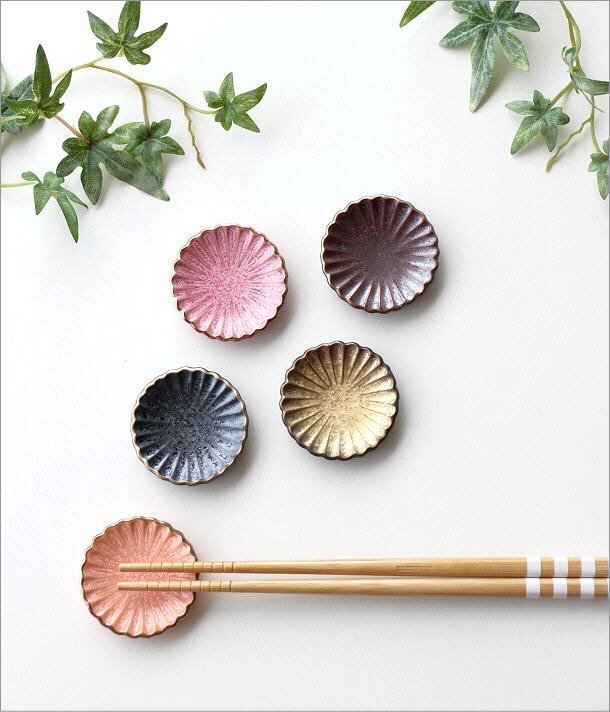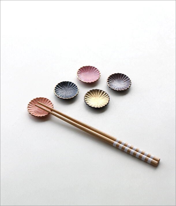 | 手のひらにすっぽり収まる 小さなサイズが可愛い 有田焼の箸置きです 菊の家紋のような箸置きは 華やかなカラーと金の縁取りの小さな菊の花が お祝いの席にもおすすめで 食卓にそっと彩りを添えてくれます ワサビや柚子胡椒など 一人ひとりの薬味入れに使いながら 箸置きも兼ねている箸置き スタッキングして収納出来て 場所が取らないのもうれしいポイントです 商品名 : 豆皿箸置き5個セット 菊 商品番号 : msg9698 一個のサイズ(cm) : 直径4×高さ0.8 材質 : 磁器 重量 : 1つにつき)10g 使用方法 : 電子レンジ)× 食洗器)〇 オーブン)× 生産国 : 日本(有田) ※底面は多少ざらざらとしている為、テーブルなどでの擦り傷にご注意ください -陶器(土物)の特性とお願い- 土物は同じ技法、同じ窯で焼成しても土や釉薬に含まれる天然鉱物などの影響や天候で焼き上がりは微妙に異なります。工業製品のように同一の物になる事はありません。手作りの不均一性、窯変、釉薬の細かいヒビ(貫入)や垂れ等は、製造元より土物の特性として良品の扱いとなります。ご理解頂きお買い求めくださいますようお願い申し上げます |