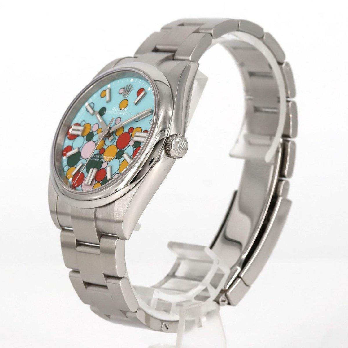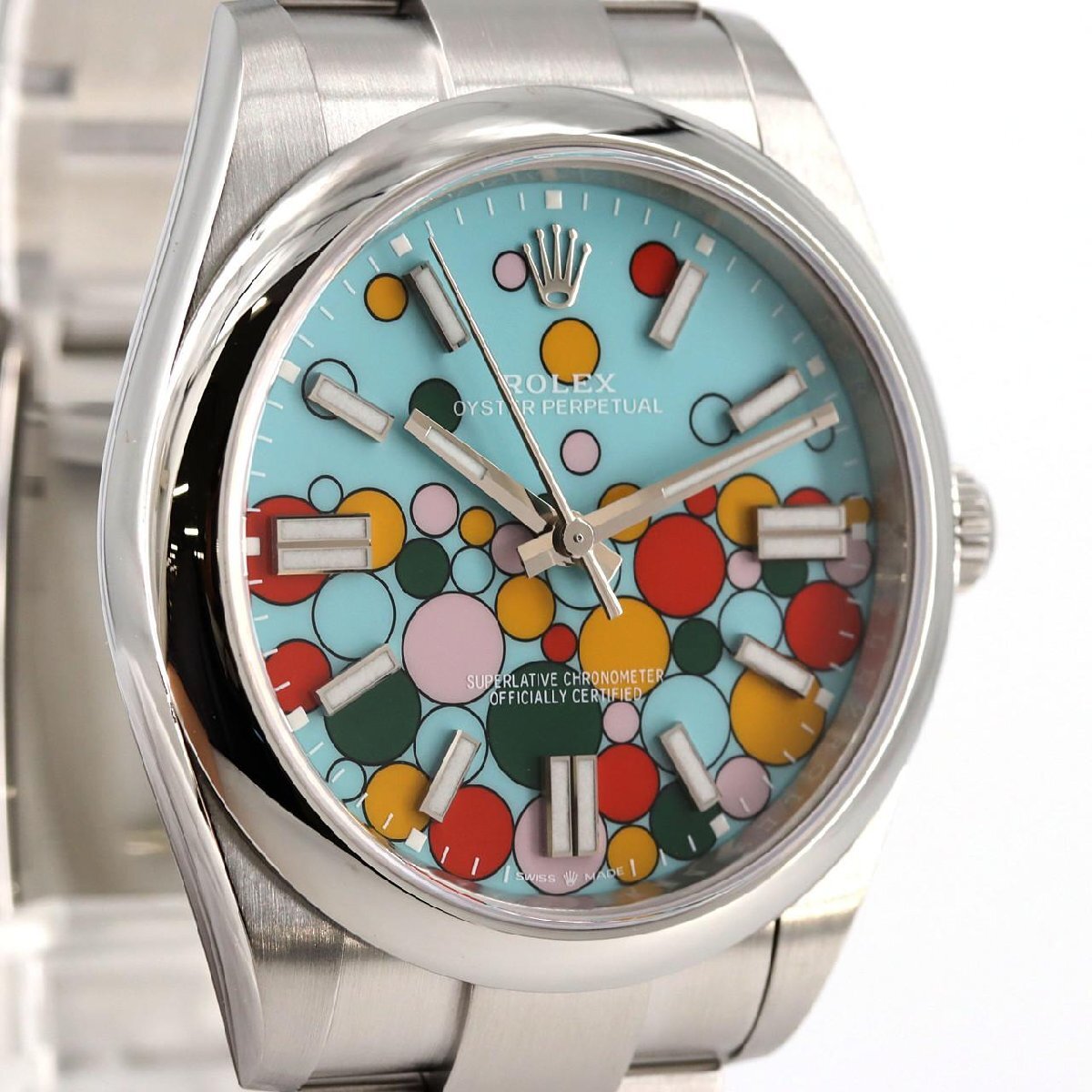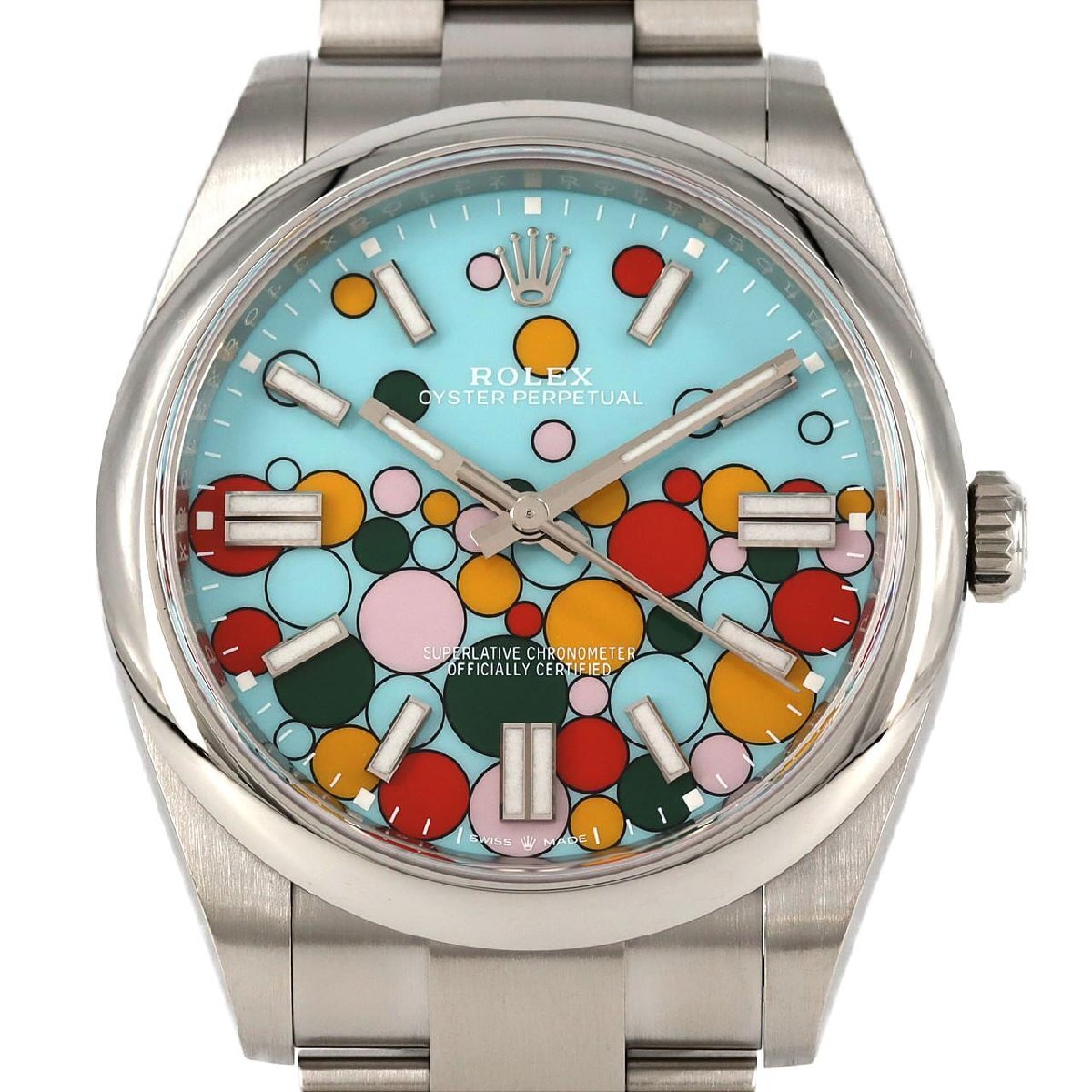 2023年に発表されたロレックスの新たなアイコン「オイスターパーペチュアル 124300」。ターコイズブルーを背景に、キャンディピンクやイエロー、コーラルレッド、グリーンといった多彩なカラーのドットが弾ける「セレブレーションモチーフ」ダイヤルが最大の特徴です。この遊び心あふれるデザインは、2020年に登場し人気を博したカラーダイヤルの集大成ともいえる特別な存在感を放ちます。堅牢な41mmのオイスタースチールケースに、約70時間のパワーリザーブを誇る高精度なCal.3230を搭載。時計製造の伝統と現代的なポップアートが融合した、腕元を華やかに彩るタイムピースです。