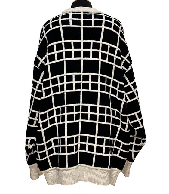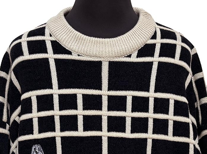 格子状のラインデザイン、刺繍ロゴとキャラクターが素敵なニットです。