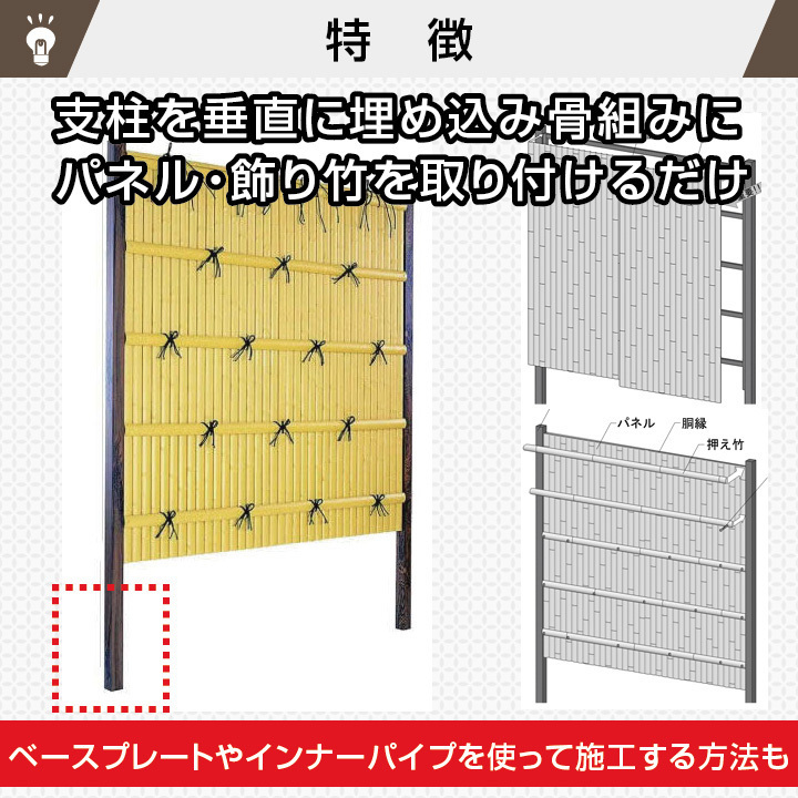 商品詳細 | この度は数ある商品の中から当商品を閲覧頂きまして有難う御座います。 商品定価 107,250円 ⇒ 販売価格 56,650円(送料・税込み) 竹垣の中でも一番人気の伝統ある建仁寺垣。 美観に優れ、軽量・耐久性のある竹垣パネルは耐変色性にも優れたAS系樹脂を使用。 汚れにくくお手入れも簡単です。 工務店様や造園業者様はもちろん、詳しい組立説明書が付いますので、 日曜大工で、お庭の外壁を和風の竹垣に変更出来ます。 商品名:人工竹垣組立セット 建仁寺垣A型(柱見せタイプ)片面 基本型 カラー:造作部 真竹、アルミ角柱 ブロンズ色 サイズ:内寸幅=1800mm H(高さ)=1800mm 柱=60mm角柱 規格より小さい幅をご希望の場合は施工時にカットして頂けましたら、 取付は可能です。2パネル以上を連結する連結型セットも格安にて提供出来ます。 連結型については、お気軽にお問い合わせ下さい。 建仁寺A型 片面 柱見せタイプ組立説明書はこちら をクリックしてください。 |