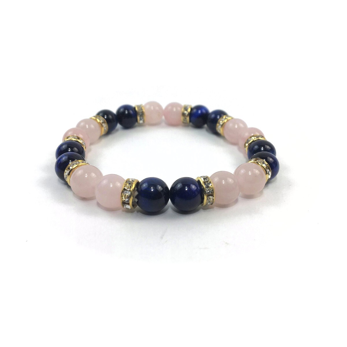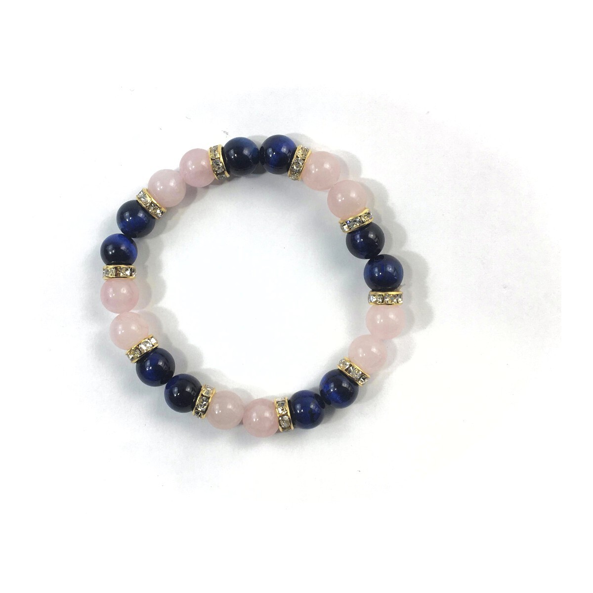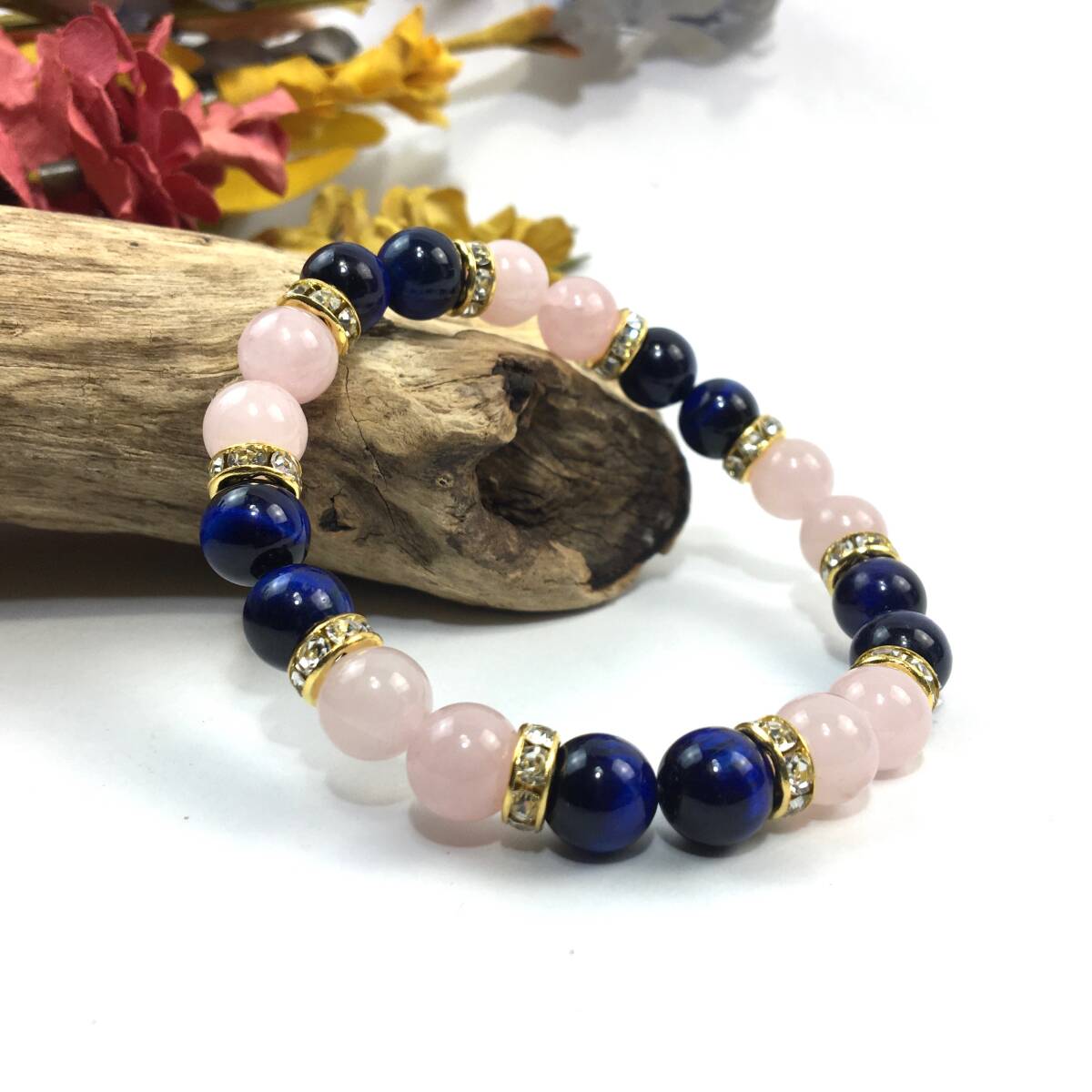 こちらは、8mm玉のローズクォーツとブルータイガーアイを使ったパワーストーンブレスレットです。シンプルなデザインでどんなコーディネートにも合わせやすいデザインに仕上げています。サイズは内周約15cmです。気になる方は是非この機会にどうぞ。