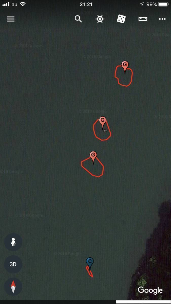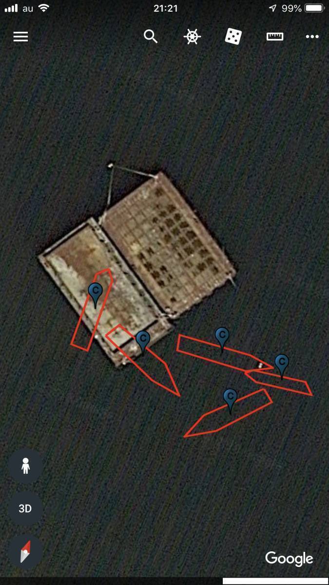 ご提供のマップの説明ですが、赤線は漁礁、沈船のパスとなります。また青のCピンは沈船、ピンクとブルーのピンは琵琶湖リサーチの浚渫マイスターのポイント、オレンジのGピンは漁礁、緑のPピンはピンポイントスポットとなります。