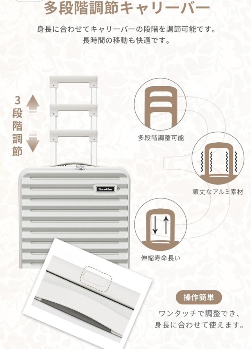 高品質のポリエステル生地で、柔らかいかつ快適です。X型ベルトが完備され、荷物崩れを完全防止。収納力抜群、たくさんの小物を入れることはできます。また、軽量で耐久性に優れたアルミ製のキャリバーを搭載し、ワンプッシュで高さを自由に調整できます。