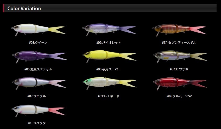 ●DRTカスタムチューンにより全てをアップデート“マッチ ザ ベイト”にこだわる「Jr.」誕生!オリジナルの「早巻きアクション」と「ライズアップアクション」を継承しつつ190mm・44gにダウンサイジング!フィールドを選ばない絶妙なサイズ感とMHクラスのロッドで対応できる扱いやすさにこだわりました。関東のフィールドや野池にもアジャストできるサイズになっており、陸っぱりアングラーにもおすすめです。またTiNY KLASH Vテールを搭載したことで、ボディの動き過ぎを制御した“ナチュラルアクション” とリップを外した“表層V字引き” でのボディのふらつきを制御します