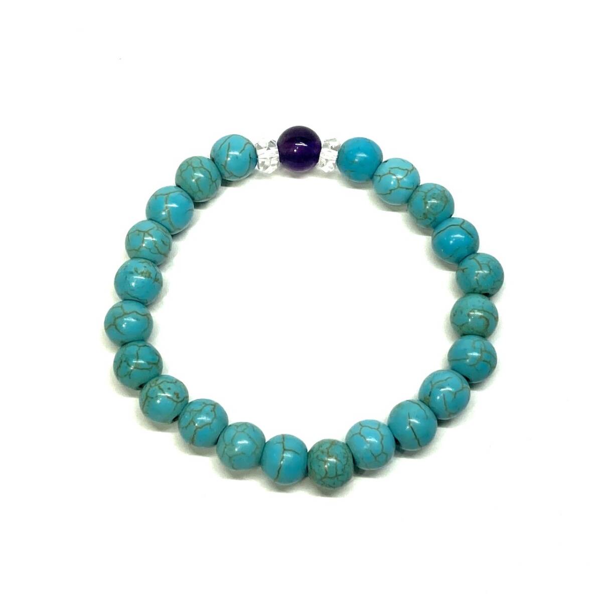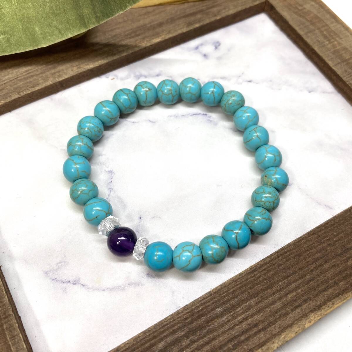 こちらは、アメジストとターコイズを組み合わせた一粒ブレスレットです。石大きさ8mm玉で基本サイズは内周15cmです。プレゼントしてもいいと思います。