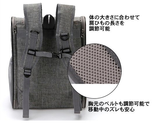ワンちゃんや猫ちゃんとお出掛けする時に便利なペットキャリーバッグです。通気性も良く、夏冬兼用のマットも付いているので快適です。中には飛び出し防止リードが付いているので、急な飛び出しにも安心ですよ。軽量かつクッションショルダーで肩の負担も軽減します。チャックも中からは開けられません。【サイズ】横幅:約35cm奥行き:約29cm高さ:約43cm重さ:約0.9kg耐荷重:約8kg【内容品】・キャリーバッグ本体・夏冬両用 底マット・可愛いペットとの移動がらくらく・底マット使用は夏用と冬用のリバーシブル仕様・高い通気性で圧迫感を軽減・折りたたみ式で不使用時もかさばらない・飛び出し防止のリードロック機能付き
