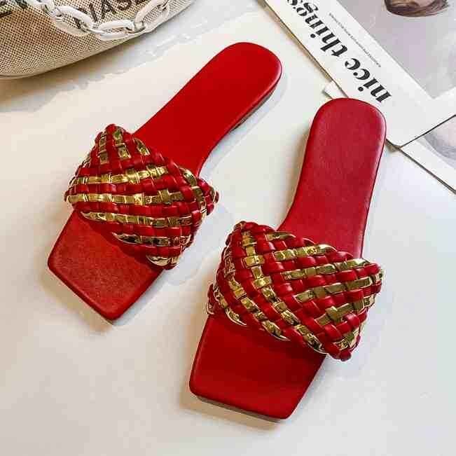 高見えするゴールドの編み込みサンダル