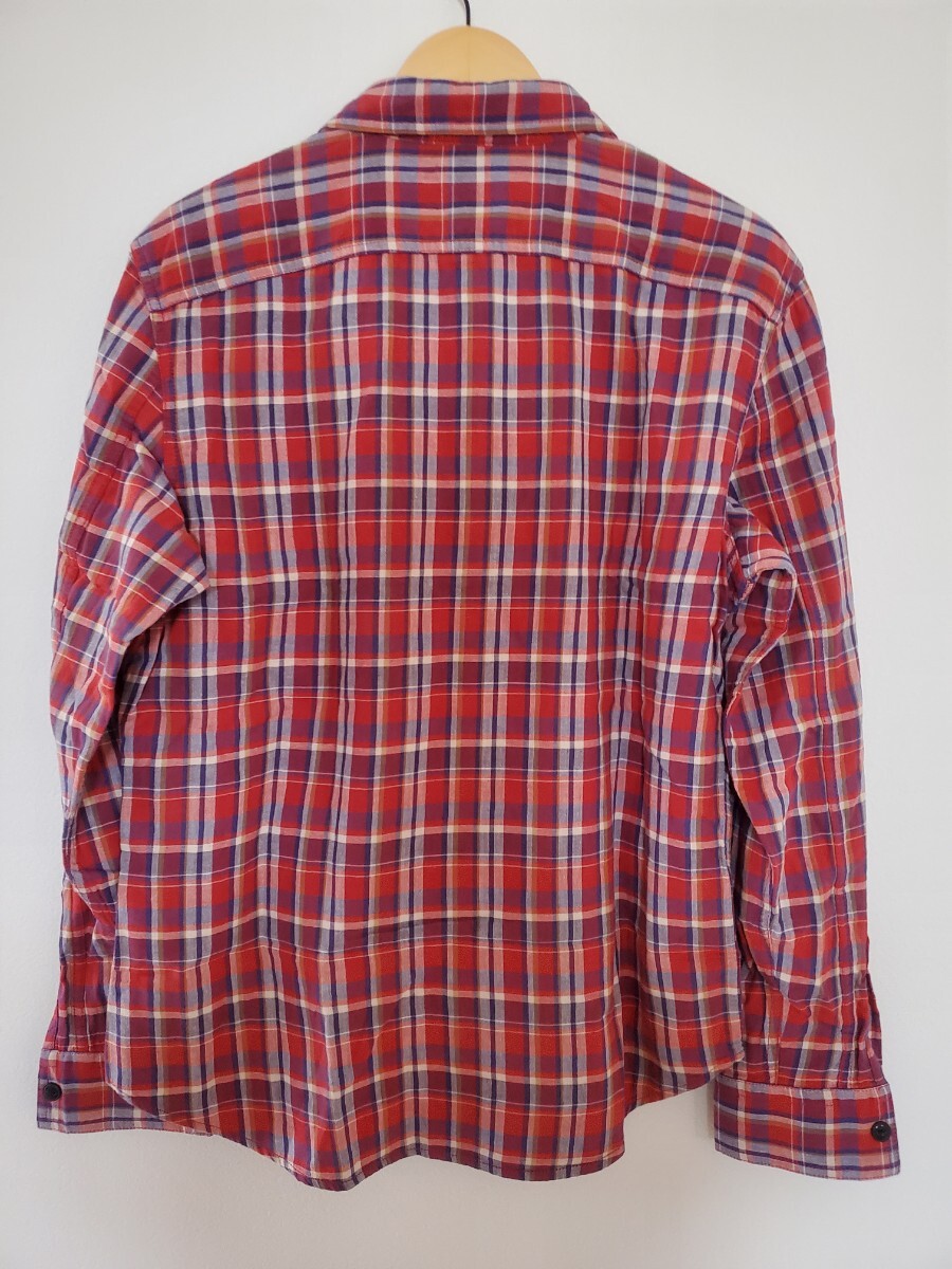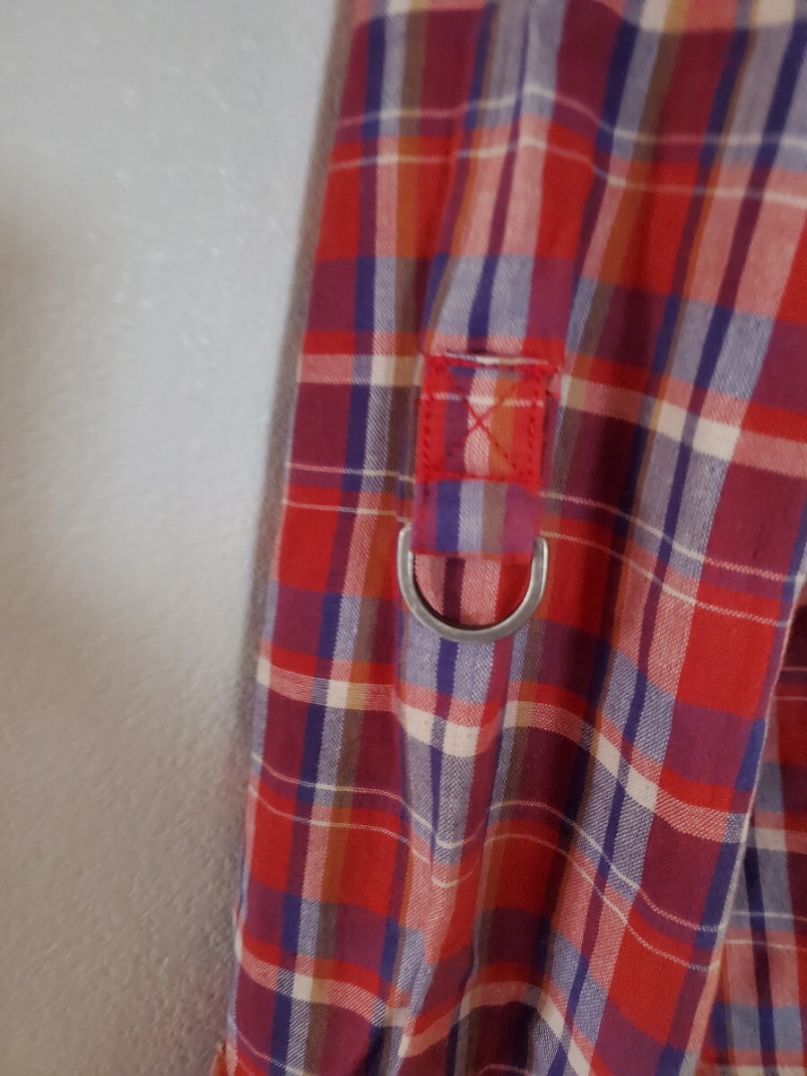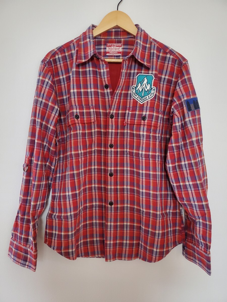 胸元に「LEVI STRAUSS & CO」のワッペン、袖には建物デザインの刺繍ワッペンが施された個性的なアイテム。Dカン付きでアウトドアやミリタリーテイストにもマッチします。レッドを基調としたチェック柄で、アメカジや古着コーデにおすすめです。