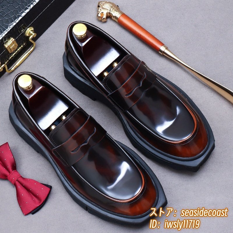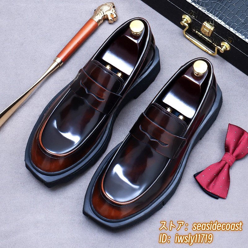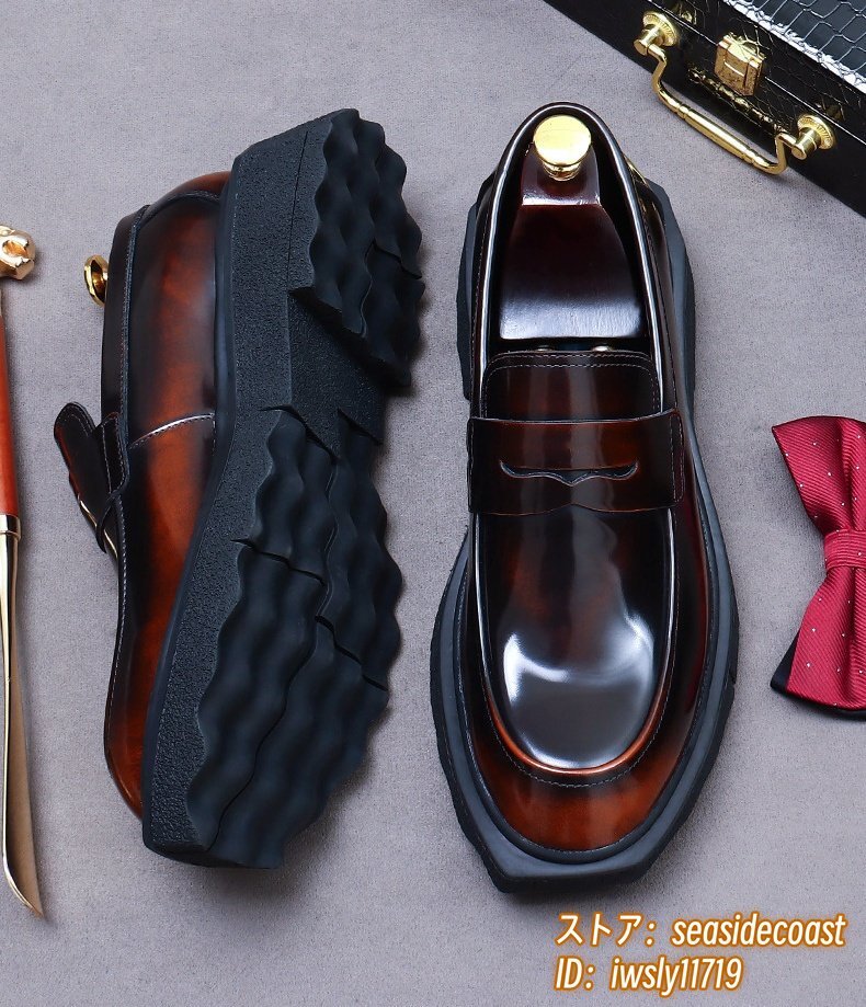 最高峰11万◆ビジネスシューズ 本革 レザーシューズ メンズ 職人手作り ローファー 牛革 紳士靴 スリッポン 厚底靴 革靴 ブラウン 27.5cm