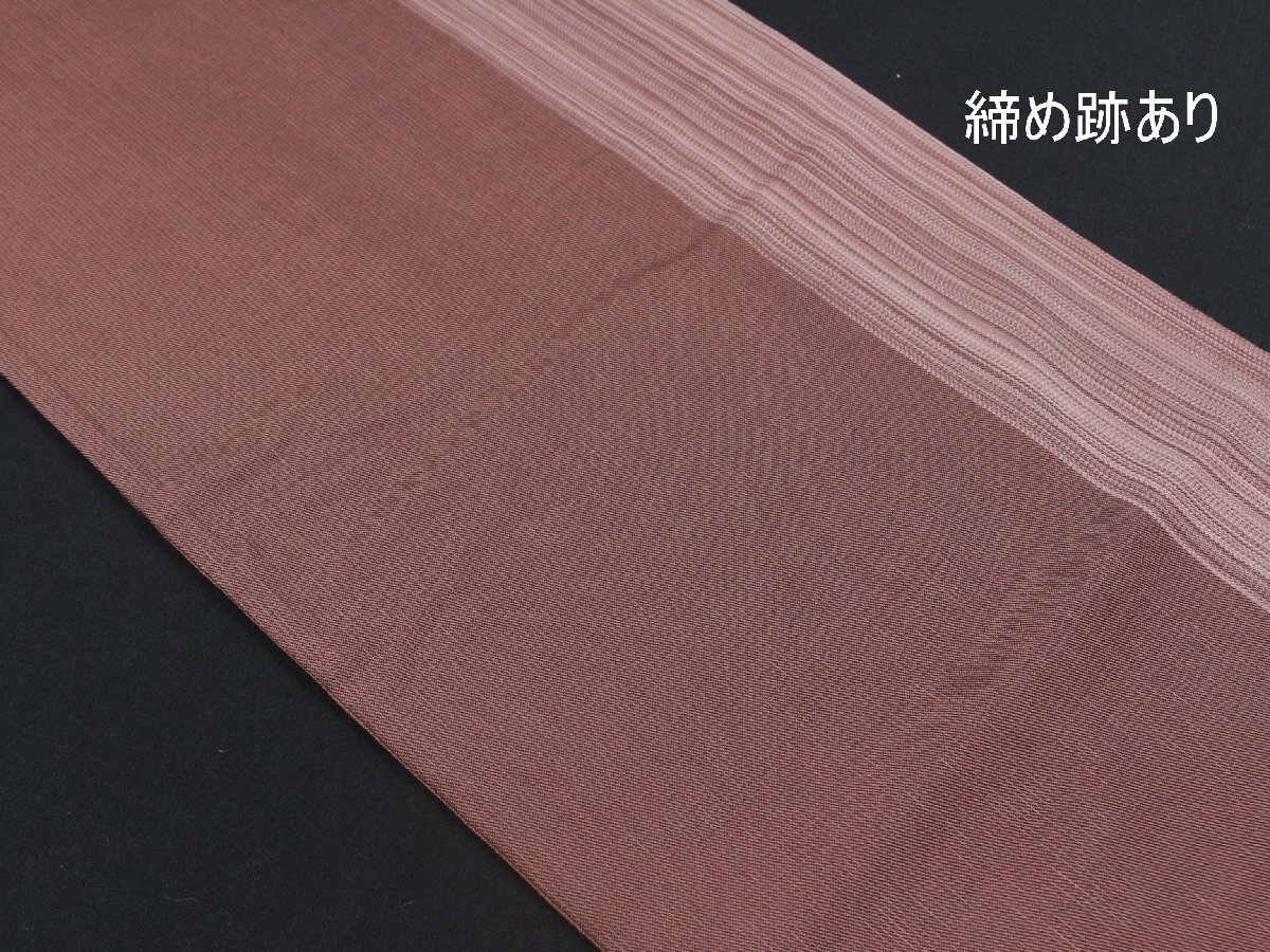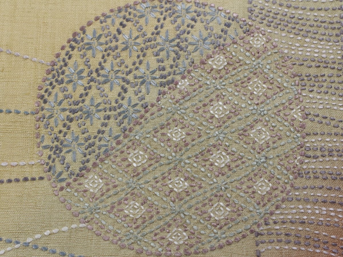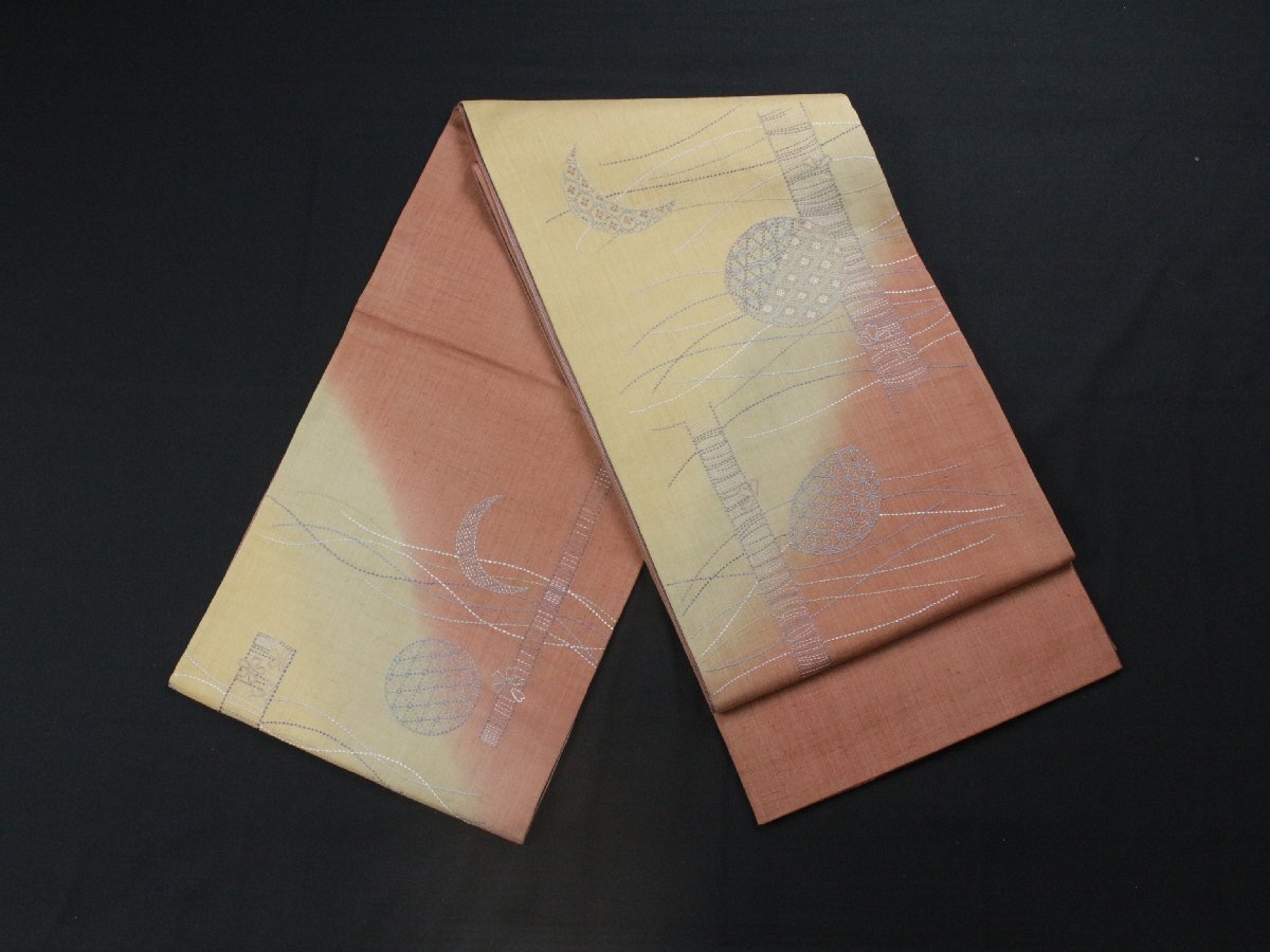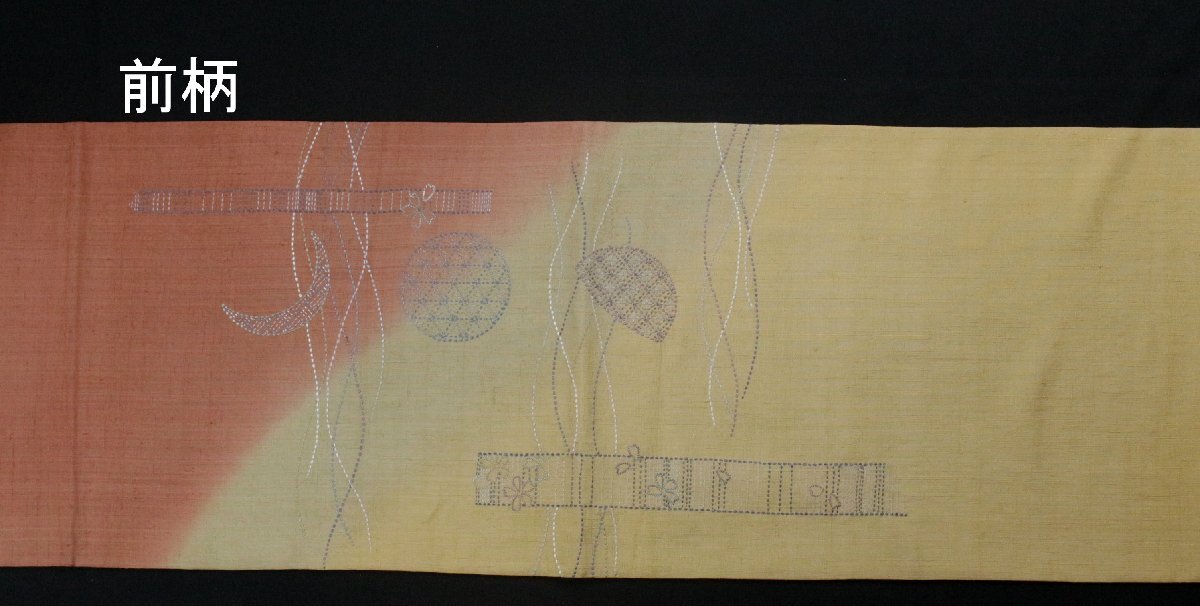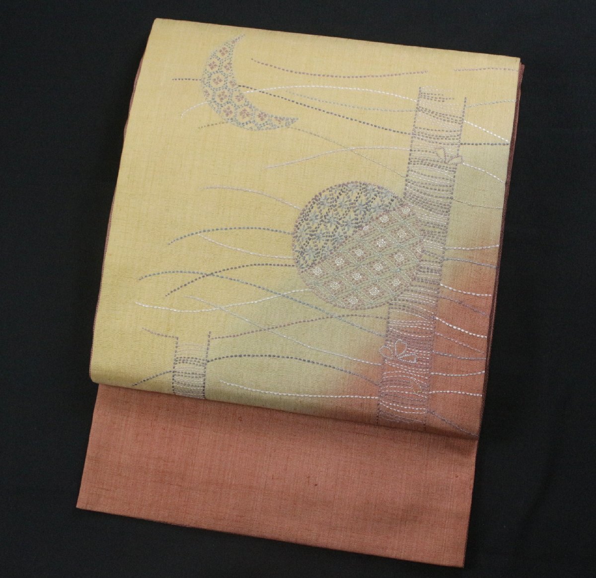 手仕事の温もりと美意識が宿る、手刺繍刺子による意匠が印象的な正絹袋帯のご紹介です。 あたたかみある朱や橙などの暖色系のグラデーションが帯地に優しく広がり、夕暮れから宵にかけての空の移ろいを思わせるような、どこか詩的な雰囲気を湛えています。 そこに丁寧な手刺繍で表現されたのは、やわらかく浮かび上がる月と、しなやかに伸びる樹木、そして流れるような線のモチーフ。 自然の情景を抽象的かつリズミカルに捉えたその構図は、静寂と動き、温かさと凛とした空気感が共存し、着姿に独特の奥行きをもたらします。 控えめな中にもしっかりとした個性が光る、まさに大人のための装いにふさわしい帯です。 日常のお出かけから観劇、美術館めぐりなど、感性を楽しむ場面でぜひお使いいただきたい、趣豊かな逸品です。 お目に留まりましたら、是非ご検討下さいませ。 ※撮影時の部屋の照明によって画像の色に若干の差がございます。色味に差がございますことをご了承のうえご検討下さいませ。 …状態… 締め跡あり。 ※全くの新品ではございませんので、記載のない変色やスレ、ヤケ、その他僅かな難がある場合がございます。そのような理由でのキャンセルはお受けできませんので、ご了承の上ご検討お願いいたします。 |