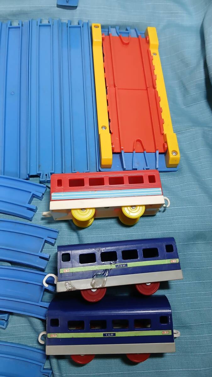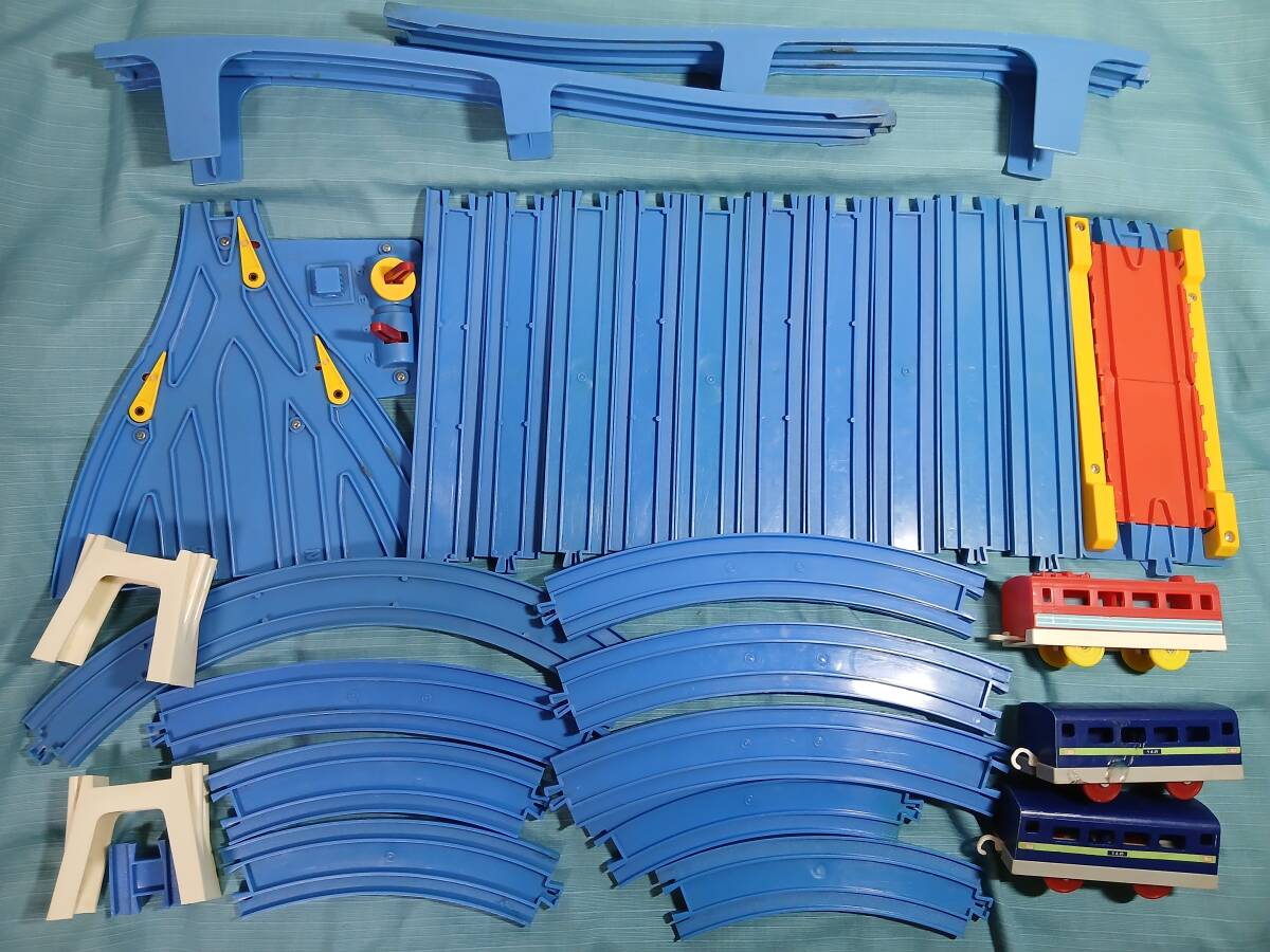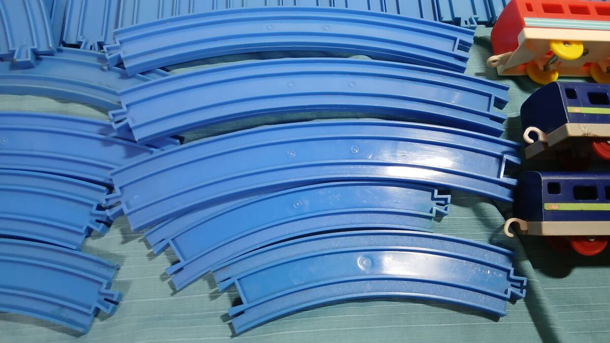 ☆てんてつき(転轍機、扇形のような切り替え線路パーツ)に古いバンザイマークのトミーのマークとMADE IN JAPANの刻印があります。その他のパーツには直線レールには1,2,5,6,11といった数字のみが刻印され、曲線の短いレールと青い客車にはMADE IN JAPAN、坂レールにはJAPANのみ刻印、その他のパーツには刻印が見当たりません。