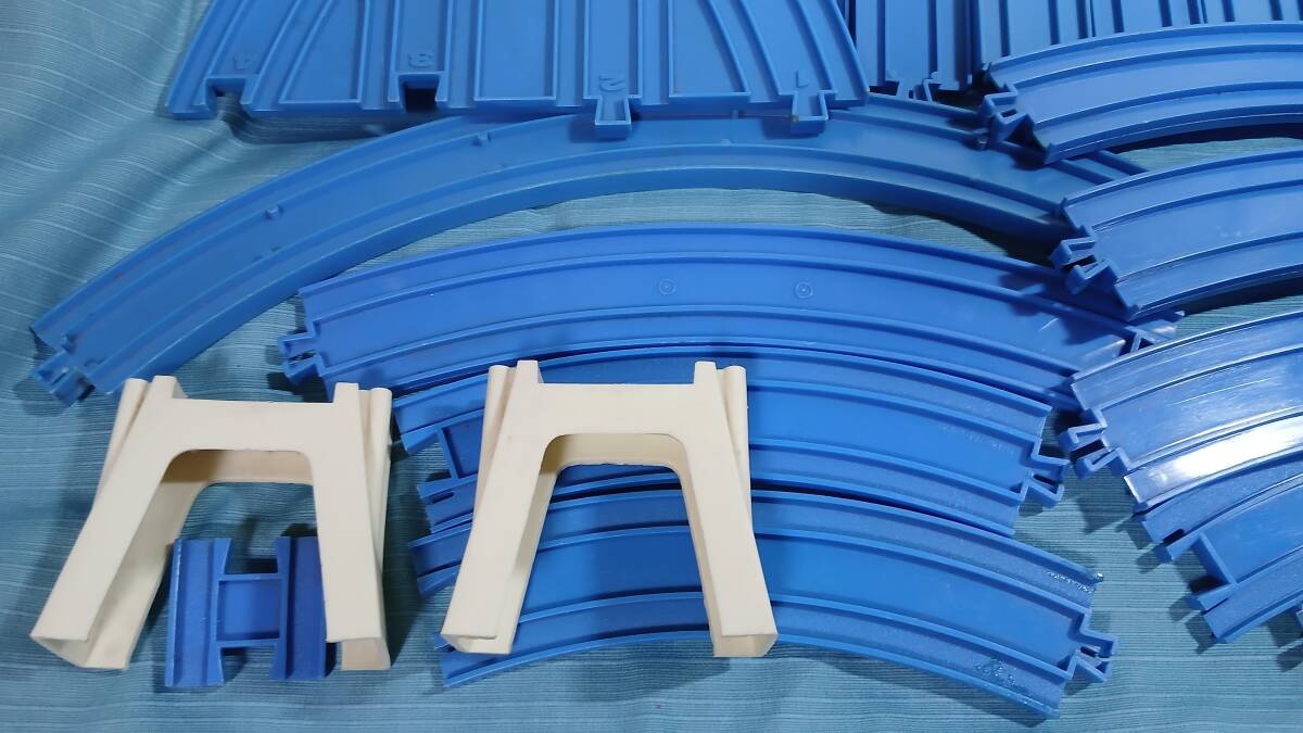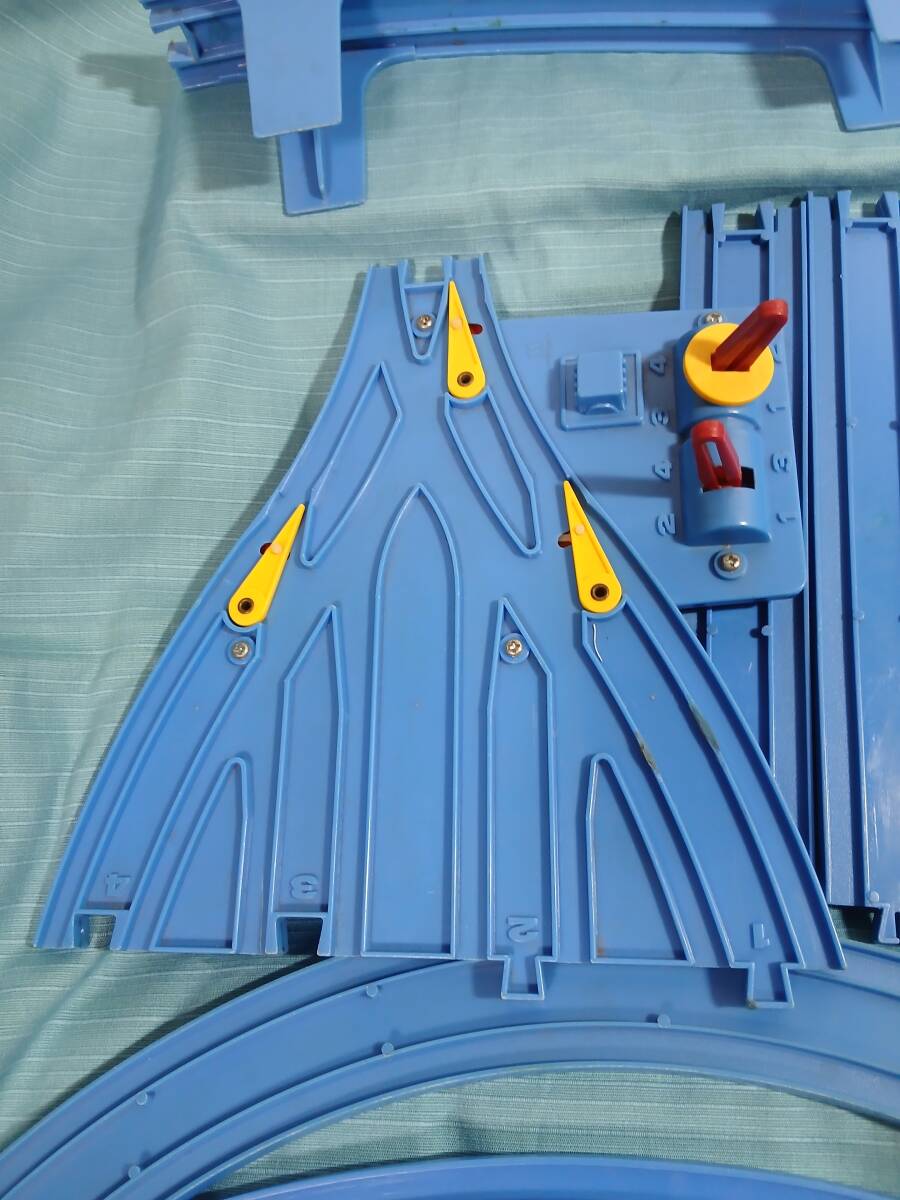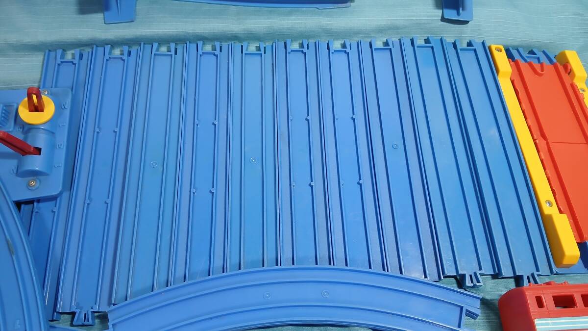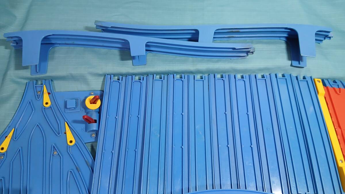 ☆てんてつき(転轍機、扇形のような切り替え線路パーツ)に古いバンザイマークのトミーのマークとMADE IN JAPANの刻印があります。その他のパーツには直線レールには1,2,5,6,11といった数字のみが刻印され、曲線の短いレールと青い客車にはMADE IN JAPAN、坂レールにはJAPANのみ刻印、その他のパーツには刻印が見当たりません。