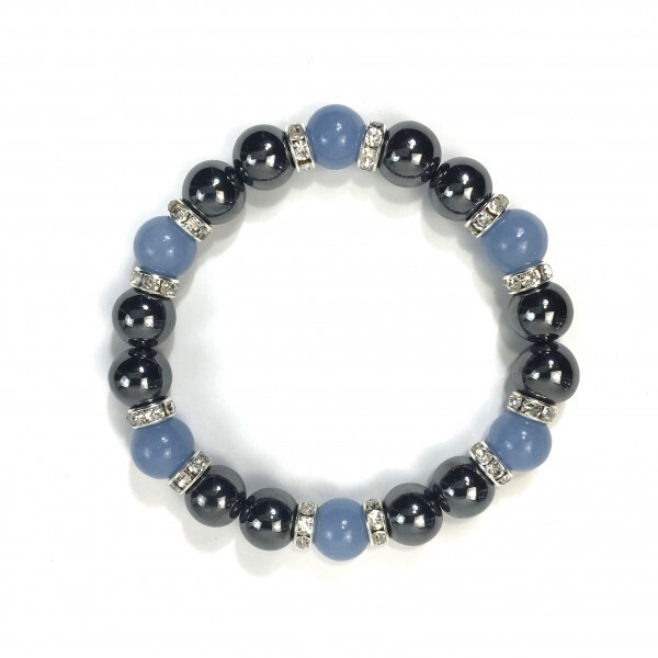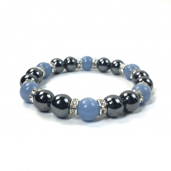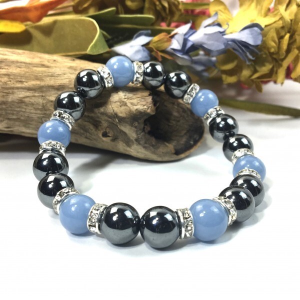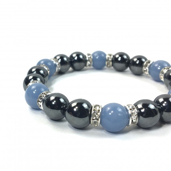 こちらは、ヘマタイトとエンジェライトを組み合わせたブレスレットです。間にはロンデルを挟み高級感あるデザインに仕上がっています。石大きさは腕にも馴染みやすいように10mm玉で内径約17cm(伸可能)です。数に限りがございますので気になる方はお早めにどうぞ。サイズ調節も可能ですのでサイズ調節の場合は取引ナビにてご一報くださいませ。(サイズ調節無料です)