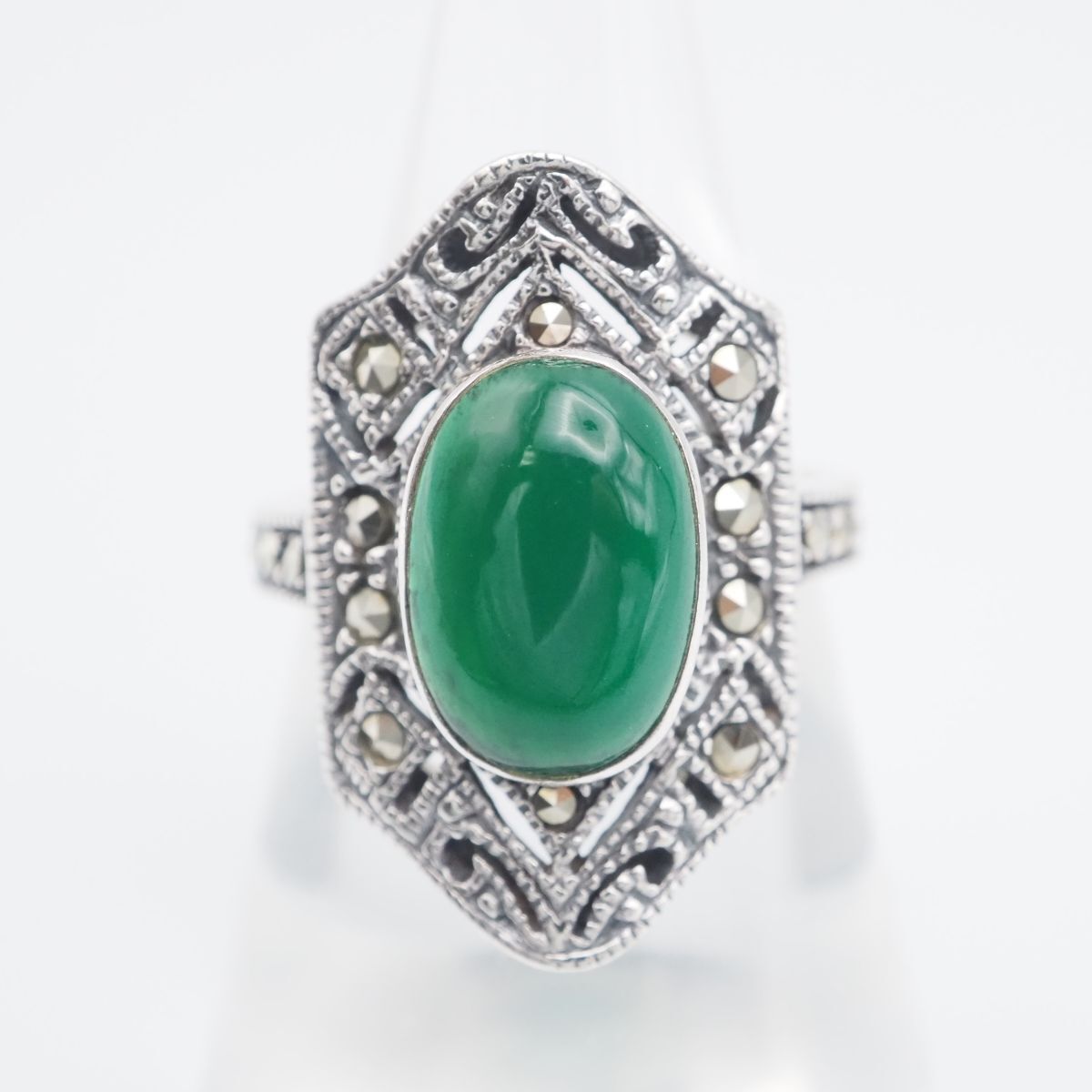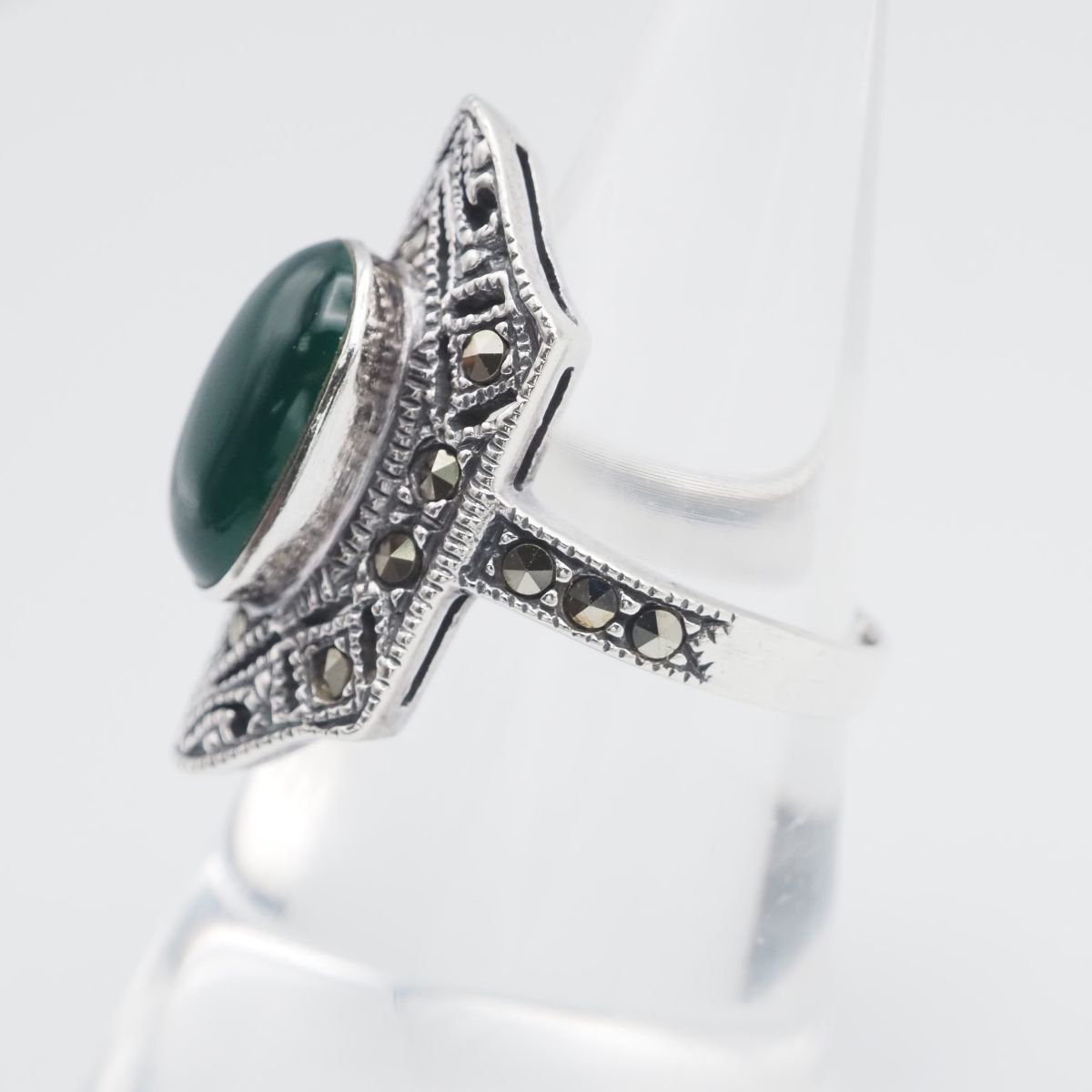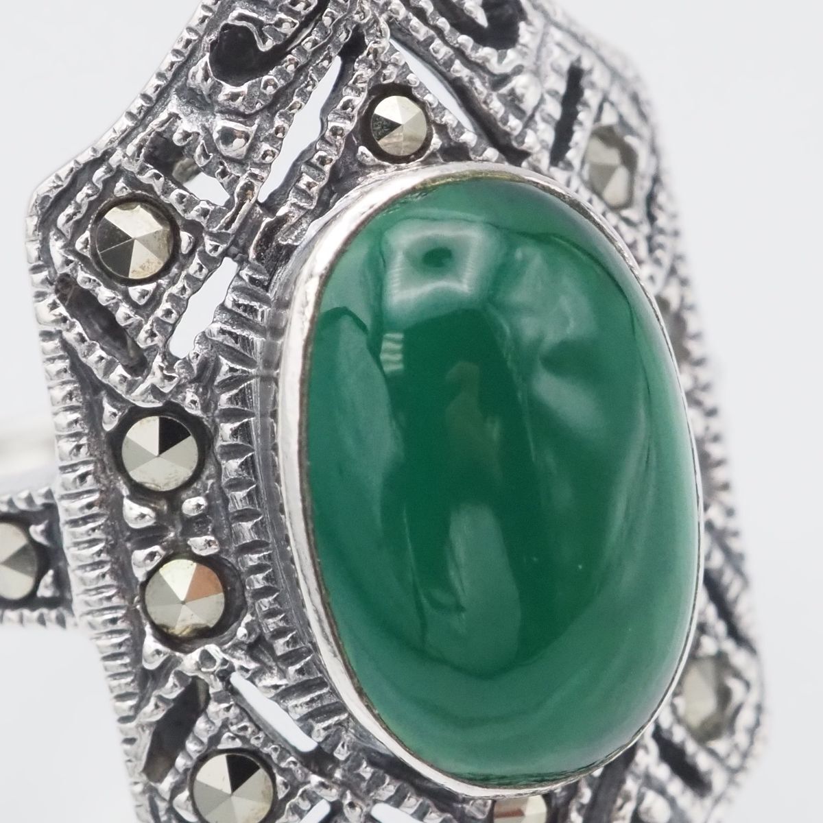 F827 グリーンアゲート 緑瑪瑙 メノウ 925刻印 リング マーカサイト マルカジット デザイン シルバー 指輪 ヴィンテージ 13号