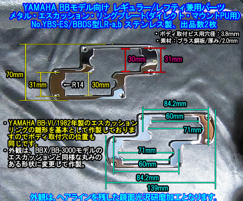 *YAMAHA BB/80年代共通品 ダイレクトマウント用 特殊な メタル・エスカッションリングプレート/レフティ兼用,ステンレス製 1枚出品/出品数2