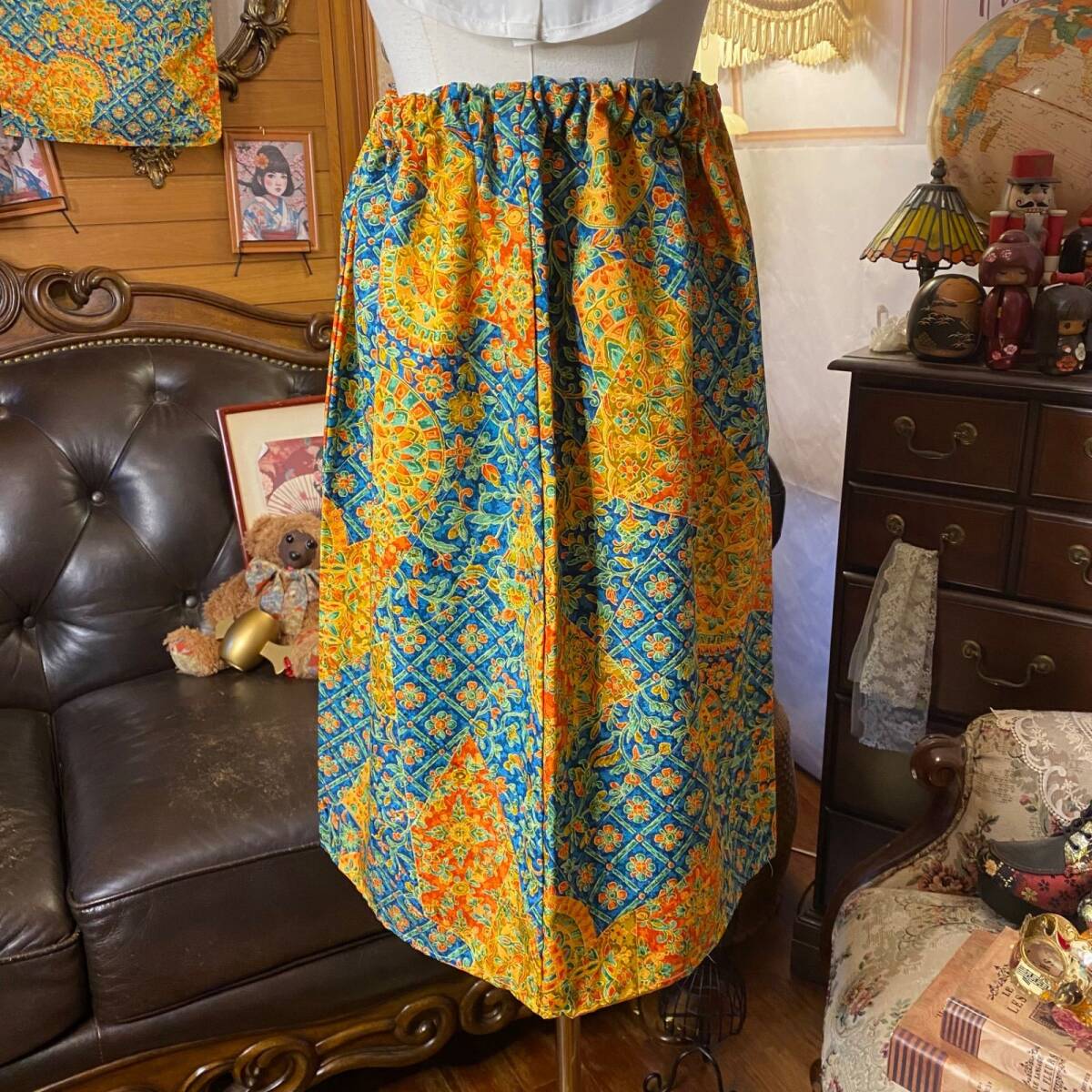 【着物リメイクセットアップ ツーピース 2部式 スカート レトロ 古着 和洋折衷 ハンドメイド 唐花とタイル風幾何をパッチワークのよう S-149】