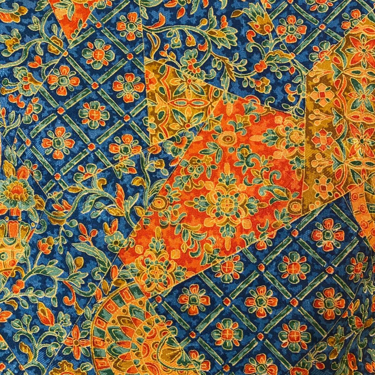 唐花とタイル風幾何をパッチワークのように重ねた主役柄。サフラン~琥珀の黄橙に、ラピス紺がきりりと映えて、若草・翡翠・朱の差し色が細やかな蔓草を彩ります。密度のある更紗と大胆な配色のコントラストで、遠目でも写真でも存在感バッチリ。