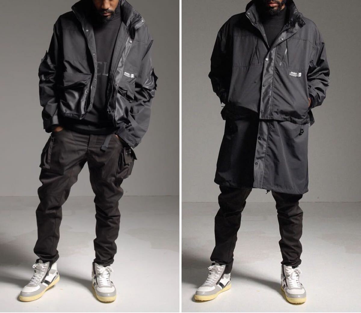 通常時はロング丈デザインのジャケットですが、ウェスト下よりファスナーでコートパーツを取り外すことでショート丈ジャケットとしても着用が可能です。