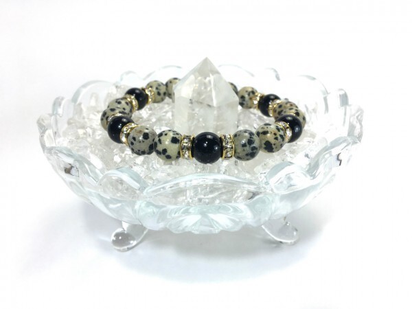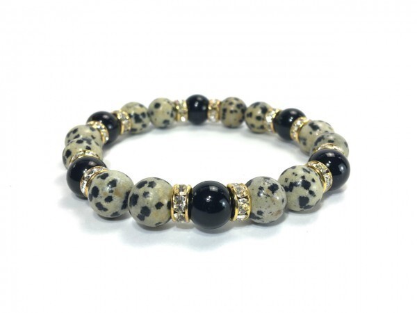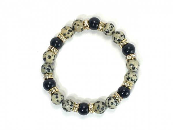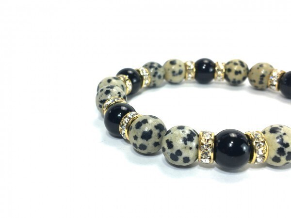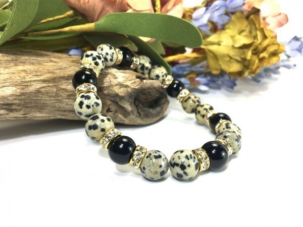 こちらは、ダルメシアンジャスパーとオニキスを組み合わせたブレスレットです。間にはロンデルを挟み高級感あるデザインに仕上がっています。石大きさは腕にも馴染みやすいように10mm玉で内径約18cm(伸可能)です。数に限りがございますので気になる方はお早めにどうぞ。サイズ調節も可能ですのでサイズ調節の場合は取引ナビにてご一報くださいませ。(サイズ調節無料です)