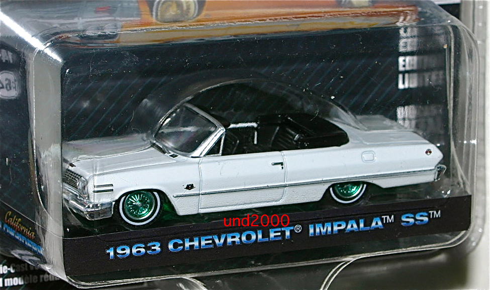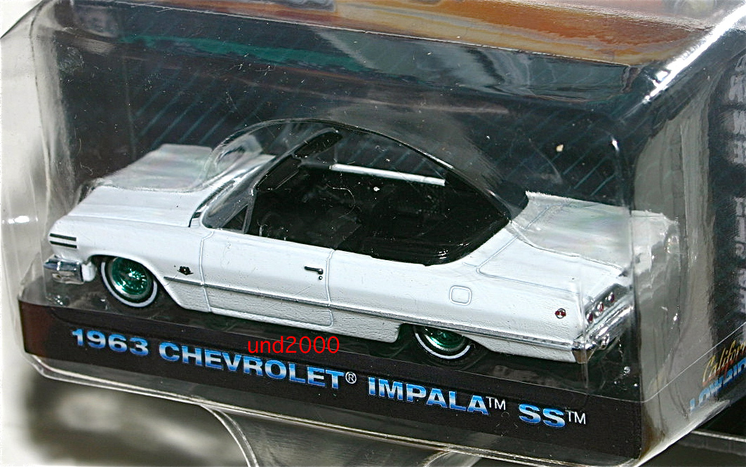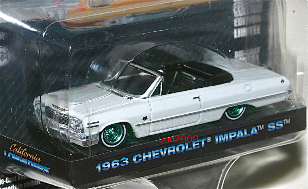 Green Light、California Lowriders シリーズ 2、1963 Chevrolet Impala SS Convertible。ホワイト。スケール1/64、トミカ・サイズ。シャーシとホイールがメタリック・グリーンののグリーンライト版トレジャー・ハント(チェスカー)、グリーン・マシーン。並行輸入品。未開封新品。ブリスターに若干のスレがあります。量産品の製品のクオリティーについてはノークレームでお願いいたします。お支払いはヤフーかんたん決済のみ。東京発、ゆうパック持込60サイズ(東京700円 - 沖縄1330円)、レターパックプラス600円、または定形外郵便(追跡番号、保険無し)450円の発送となります。(上記の送料はこの出品物のみの料金となります。複数落札、同梱包発送の場合、重さ、サイズが変わりますので送料が変わります。)3日以内のご連絡、かんたん決済の支払期限内(通常5日、支払方法により異なります)のお支払い厳守でお願いします。入札される前に「自己紹介」もあわせてお読みください。 検索用ワード グリーンライト Chevy シェビー Low Rider カリフォルニア・ローライダーズ コンバーチブル Green Machine Chase チェスカー チェース チェス