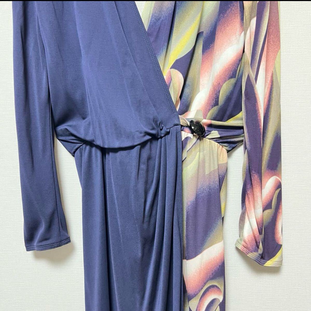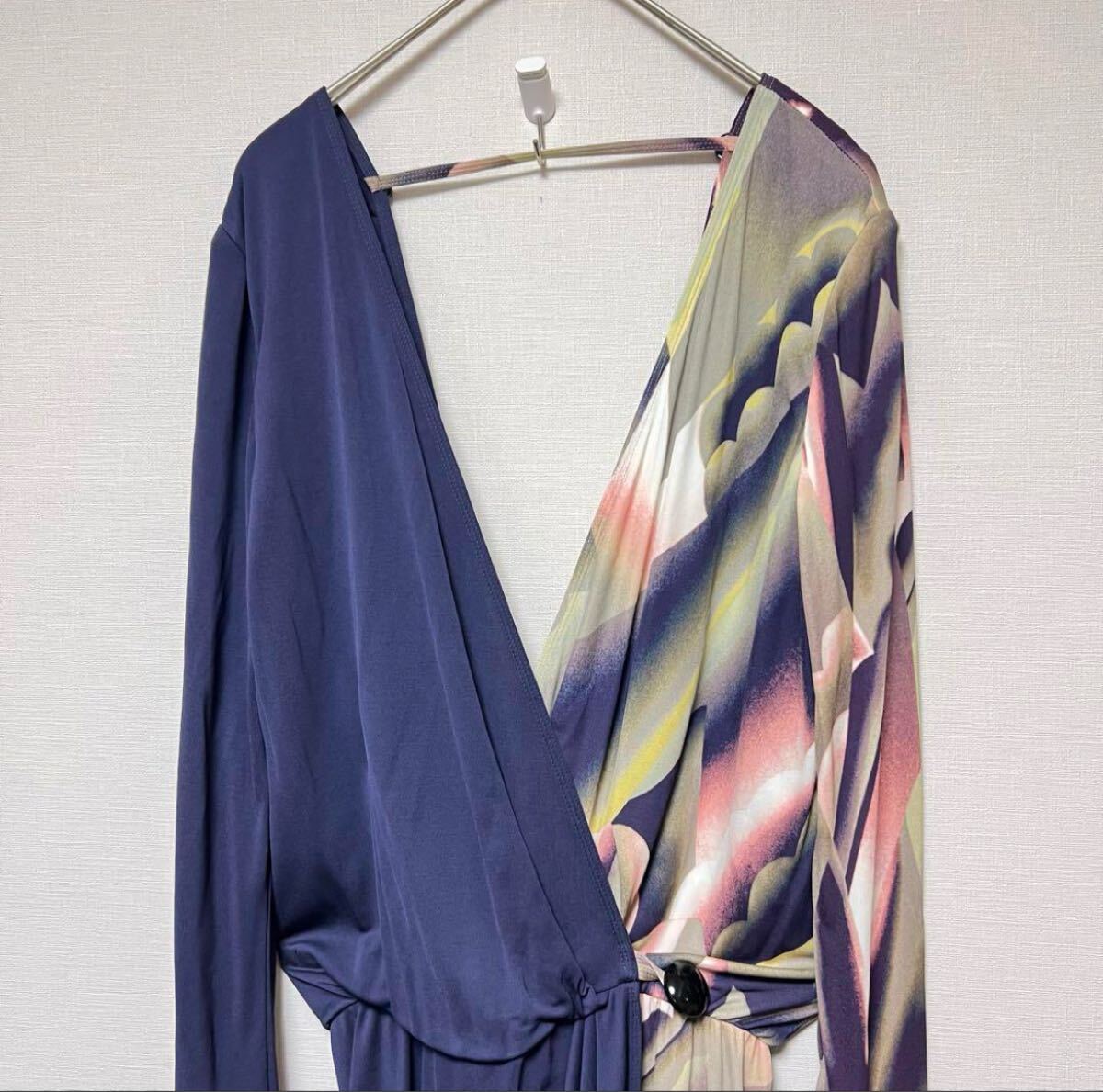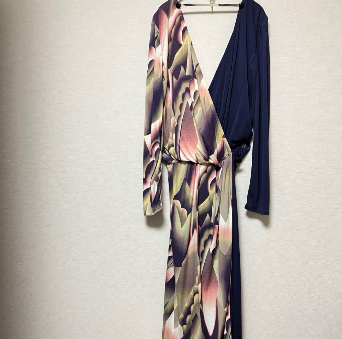 ネイビーと花柄のラップスタイルワンピース、長袖、ウエストに結び目が特徴。