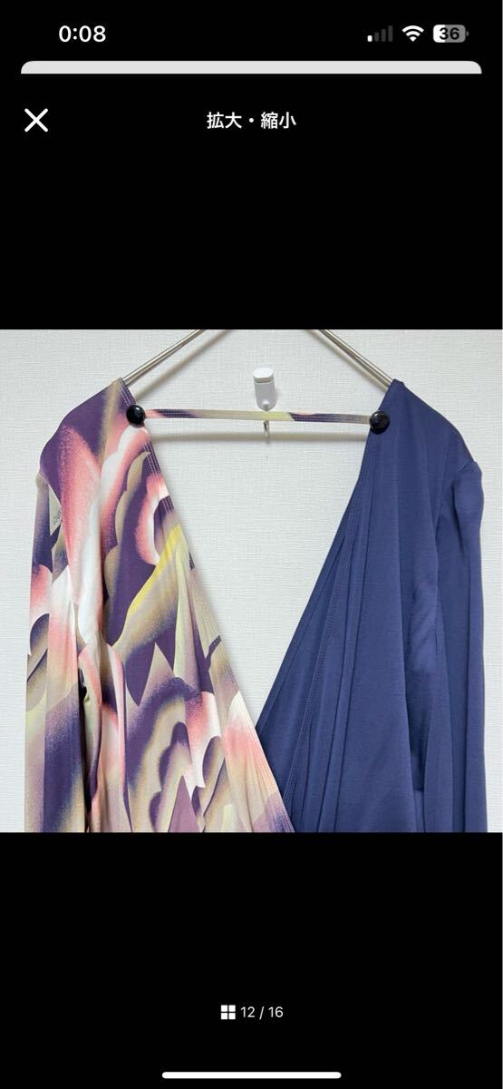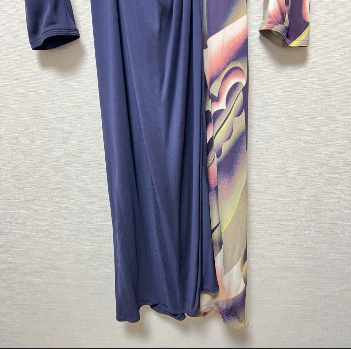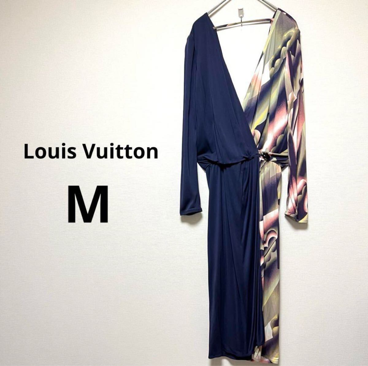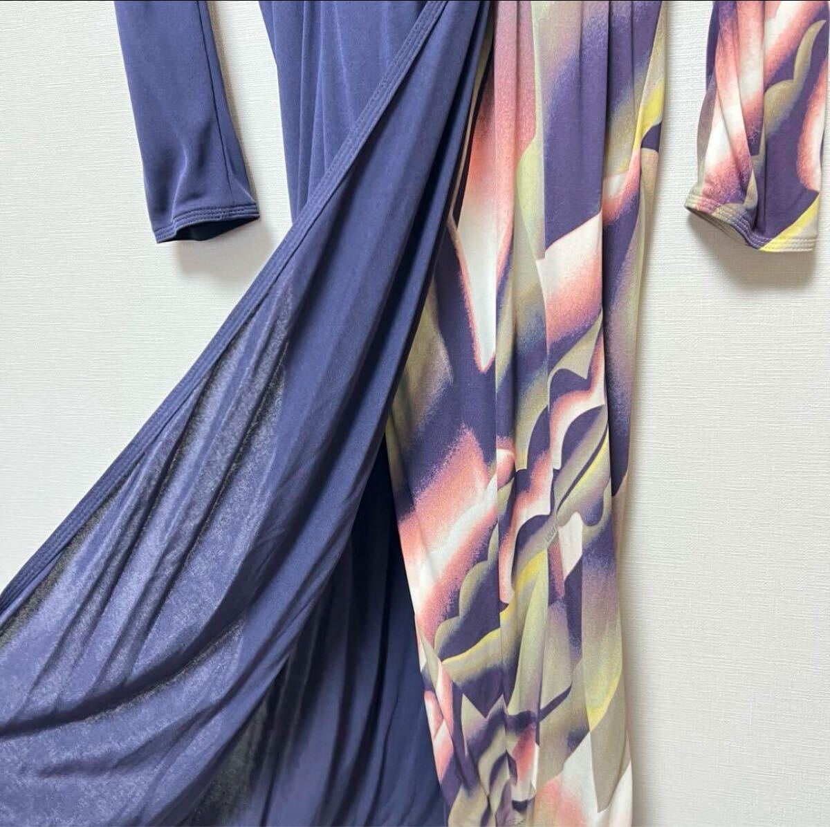 ネイビーと花柄のラップスタイルワンピース、長袖、ウエストに結び目が特徴。