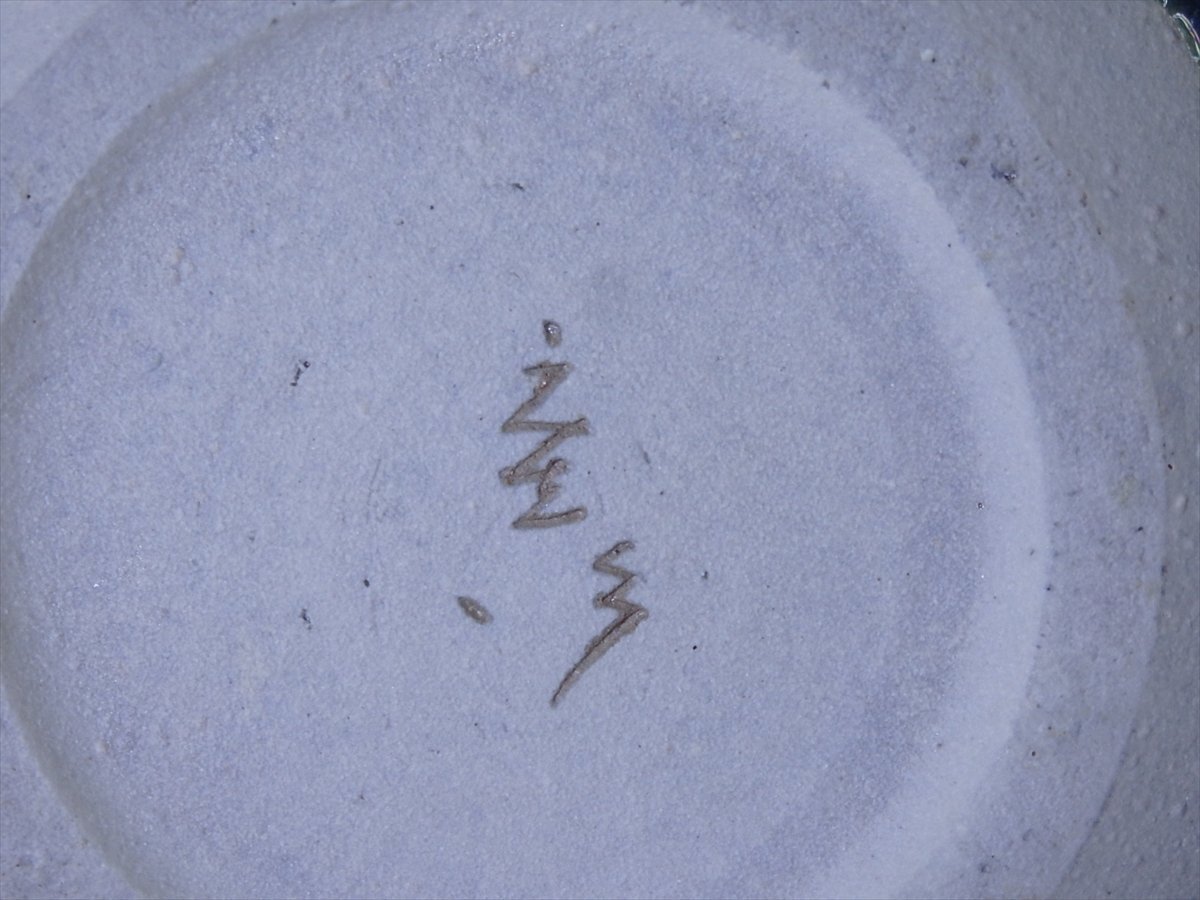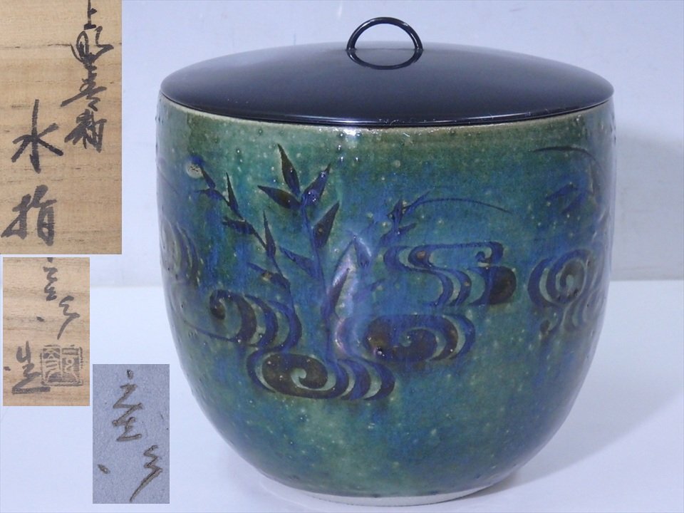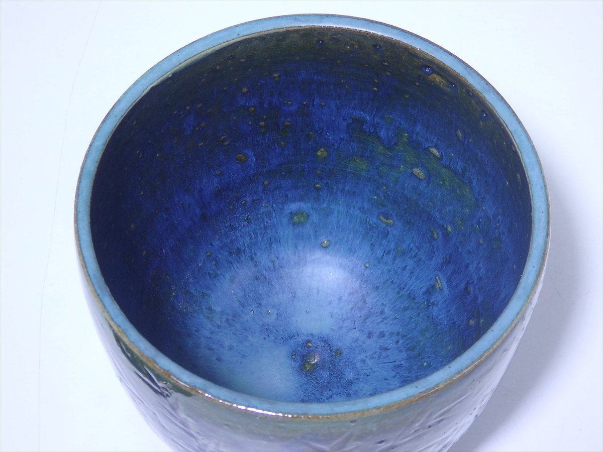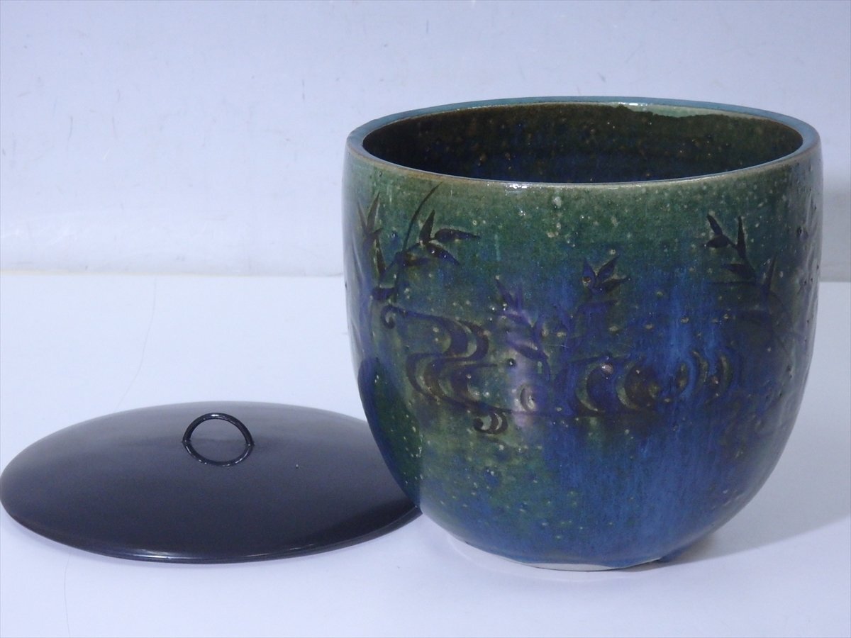 【管理番号5-0924218-8 スタッフコメント:iy】  ☆流水に草の彫り。美しく深いグリーン、内側は深海のブルー。大ぶり。こんもりと丸みのある形もよいものです。底に作家の銘あり。割れや欠けはなく状態の良いお品です。共箱入り、栞付き。
