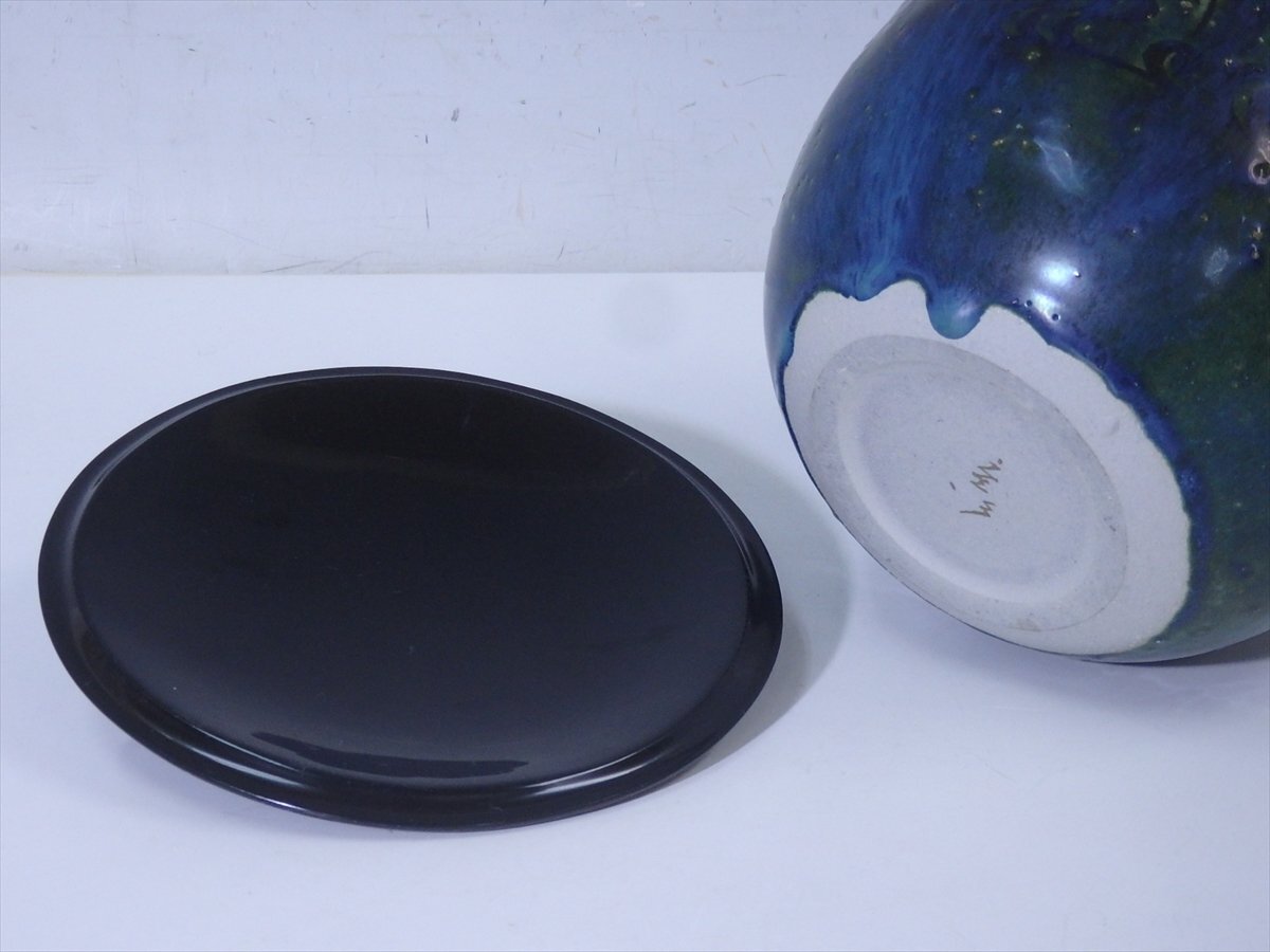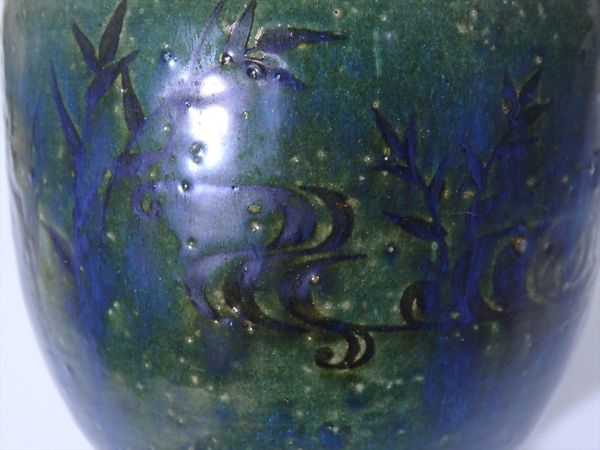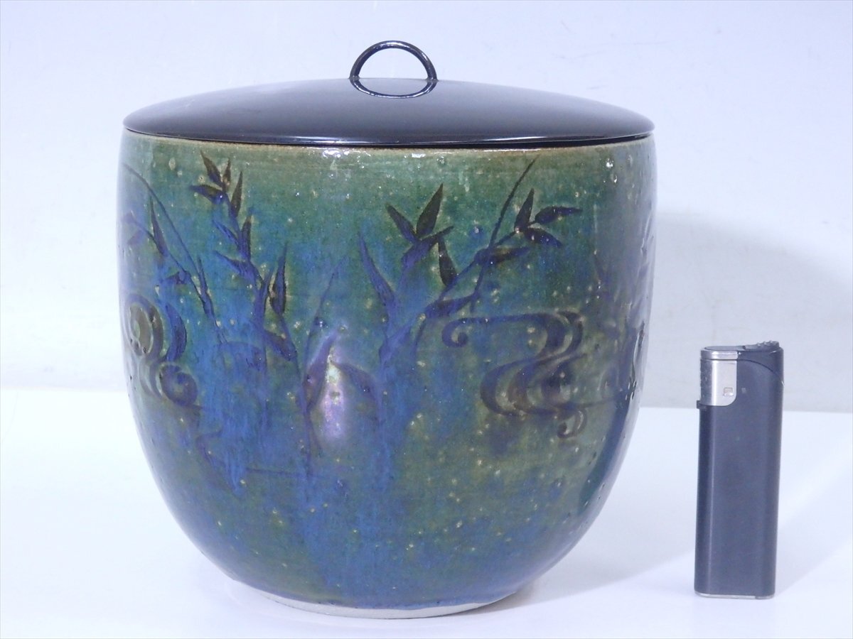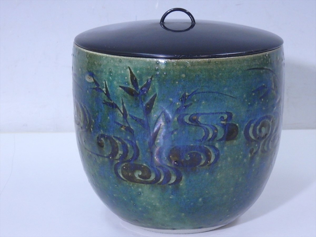【管理番号5-0924218-8 スタッフコメント:iy】  ☆流水に草の彫り。美しく深いグリーン、内側は深海のブルー。大ぶり。こんもりと丸みのある形もよいものです。底に作家の銘あり。割れや欠けはなく状態の良いお品です。共箱入り、栞付き。