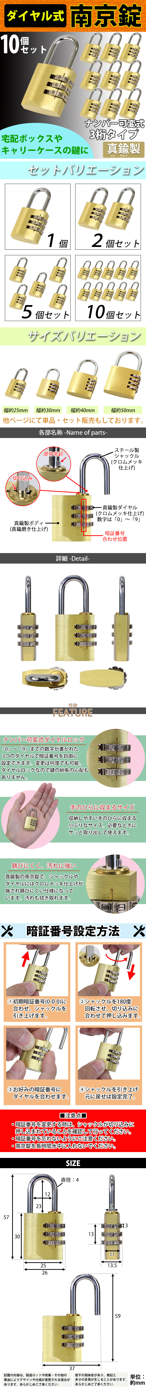 | 商品名 | 送料無料 ダイヤル式 南京錠 幅約25mm 10個セット シャックル径約4mm 真鍮 3桁タイプ 可変式 ダイヤルロック ダイヤル錠 コンビネーション パド ロック ガードロック チェンジロック 盗難防止 防犯 暗証番号 宅配ボックス ロッカー ポスト キャリーケース nankinl2510p |