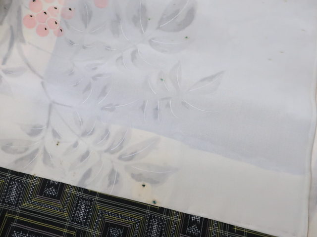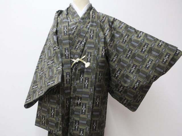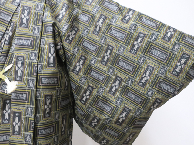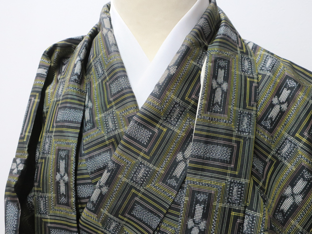 リサイクル商品のため、着物の裏地にほつれ、八掛の裾や衿に薄汚れ、胴裏にスナップボタンによる汚れがございます。 また、羽織の羽裏にシミがございますが、着用可能なお品です。 地色は、紺・黄色です。 1枚目の画像が近いお色かと思われます。 素材は正絹です。 |