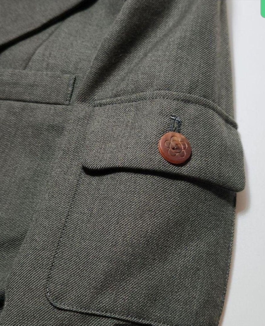 カーキ系のしっかりとした生地感に、袖フラップポケットや木調ボタンなど、ミリタリーとテーラードを融合した個性的なデザイン。