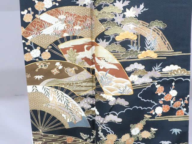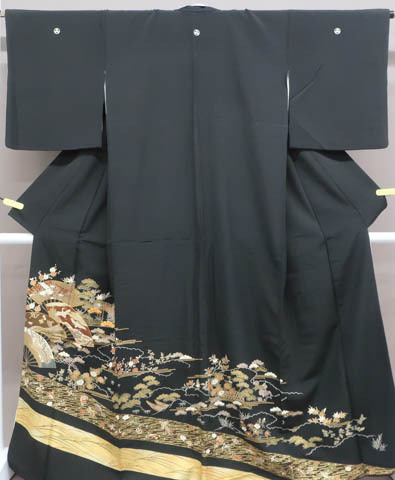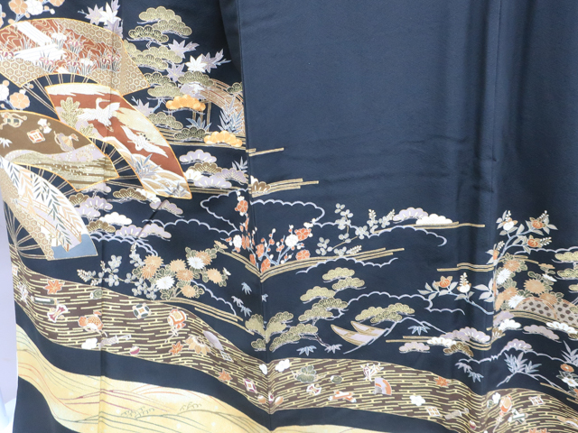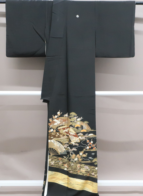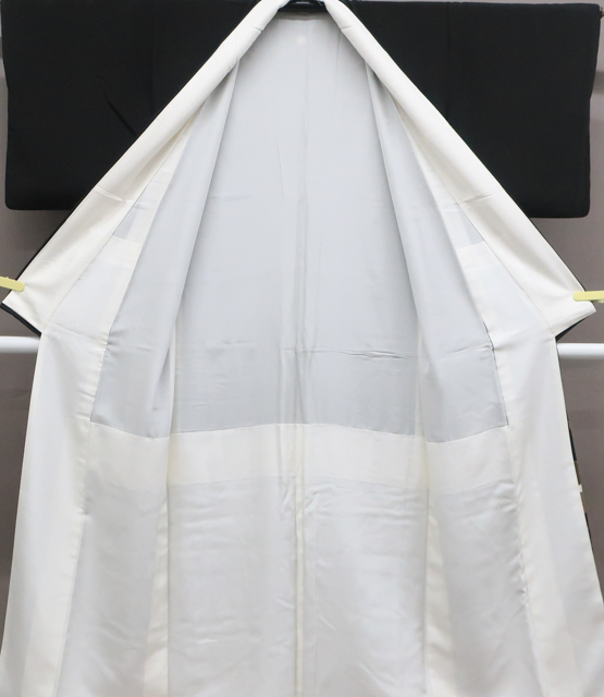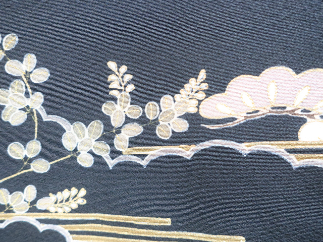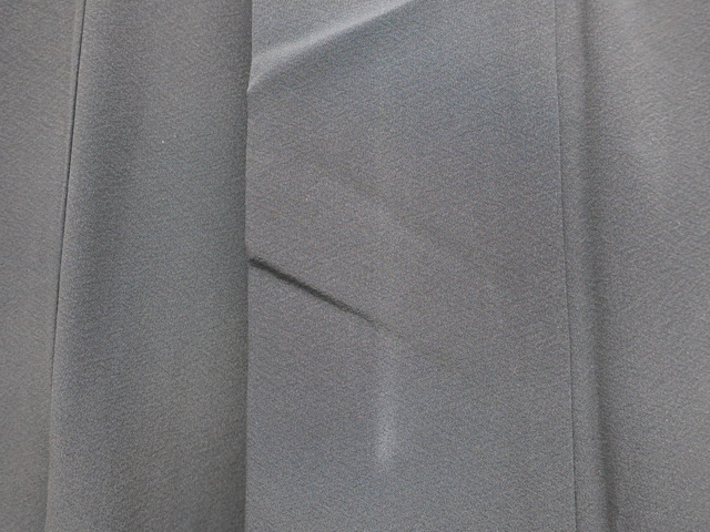 リサイクル商品のため、衿や右後ろ身頃に薄汚れ、右前袖に汚れがございますが着用可能なお品です。 地色は、黒色です。 1枚目の画像が近いお色かと思われます。 素材は正絹です。 |