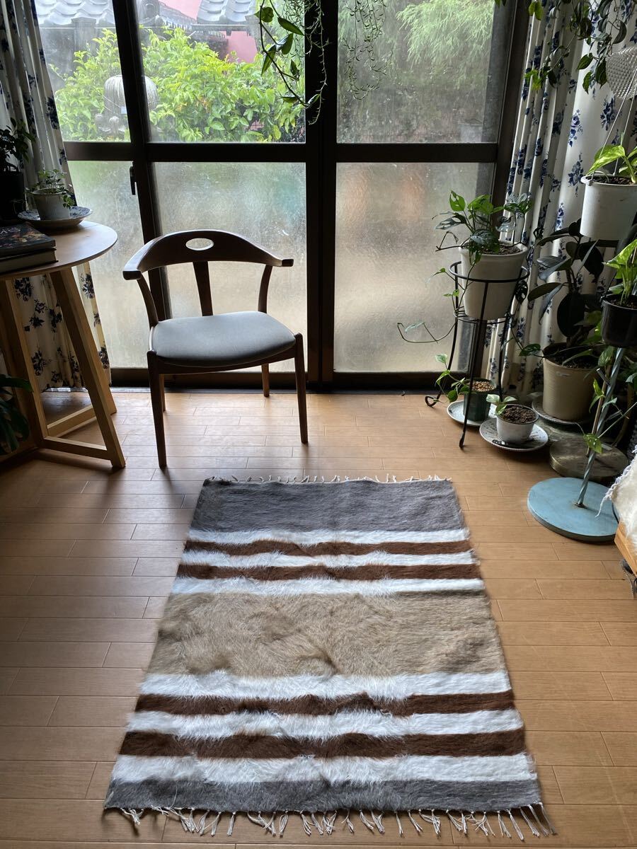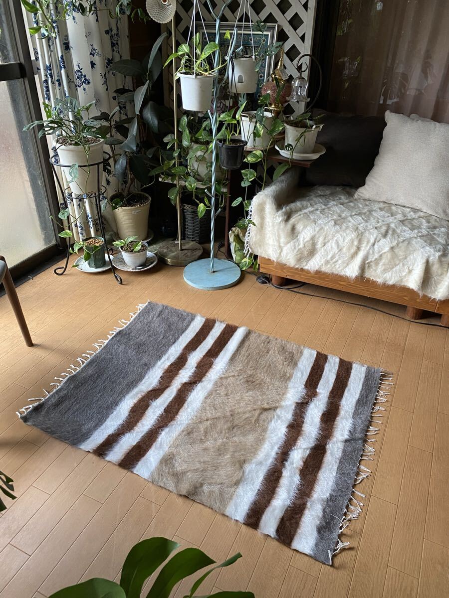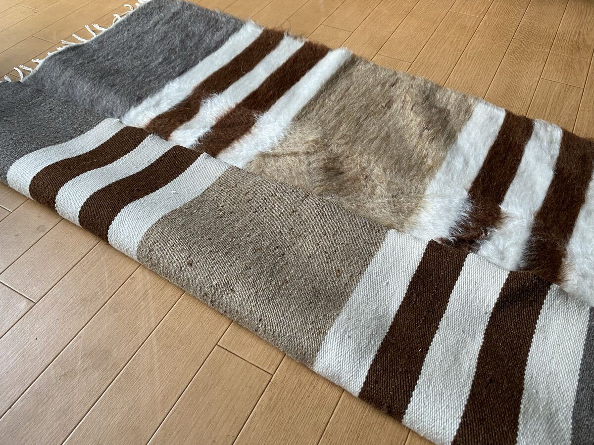 山羊ならではの模様をお楽しみください。 片面だけ毛が出ていて裏は毛がとってあるのだとおもいますので、裏面でお使いいただければ、普通のキリムとして も使えます。 冬は毛がある面で、夏は裏面でキリムとしてお使いいただける優れものです。 また毛のある表は毛をけばだたせて、模様も作っていますのでとてもおしゃれ度が高いです。 新品未使用品です。
