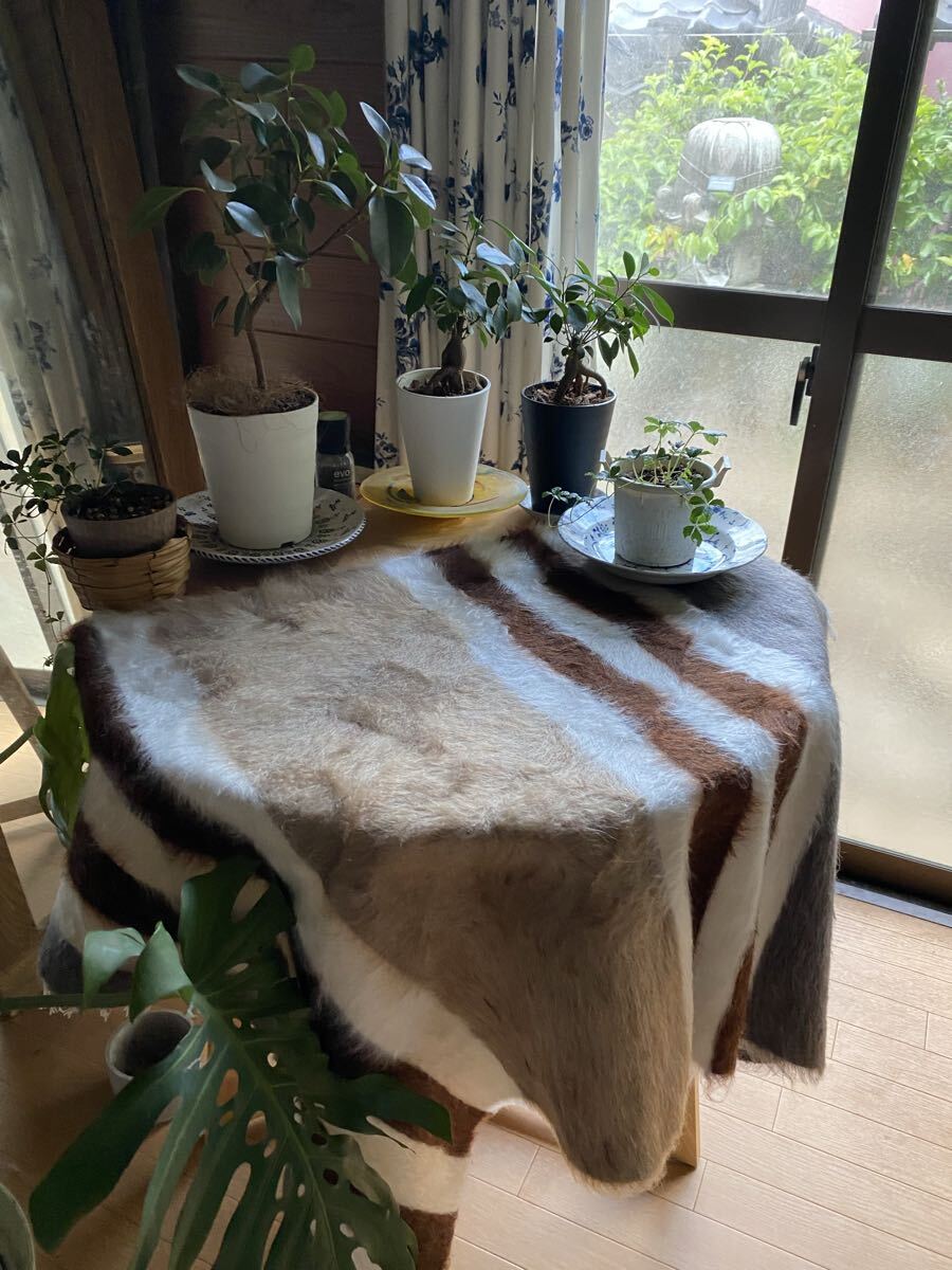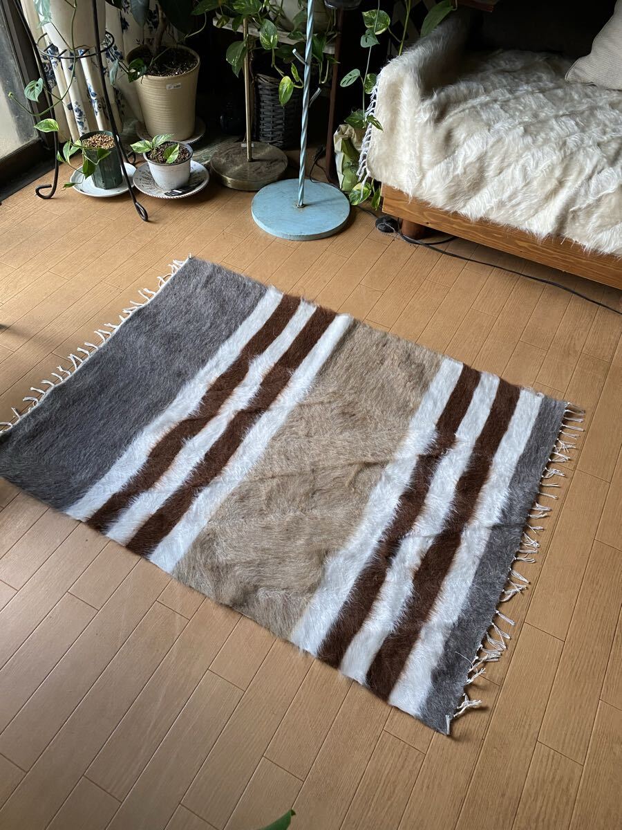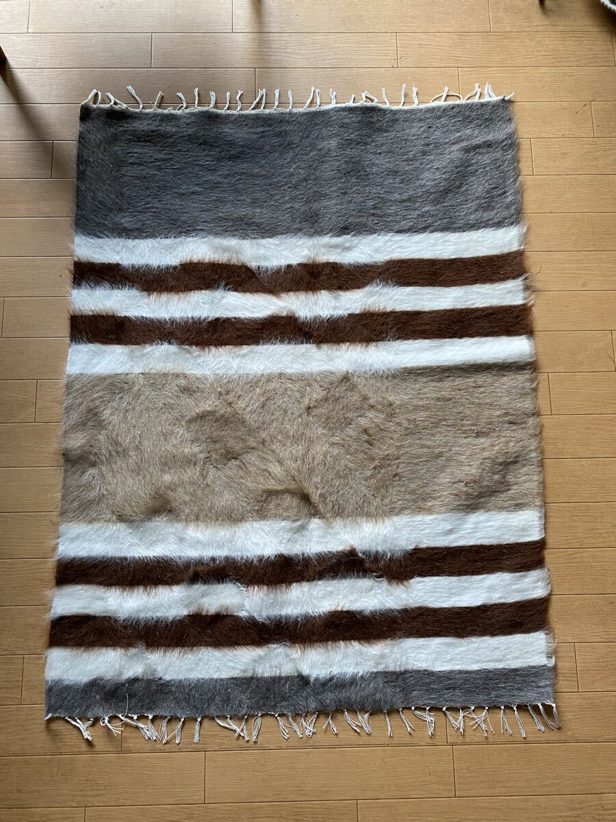 山羊ならではの模様をお楽しみください。 片面だけ毛が出ていて裏は毛がとってあるのだとおもいますので、裏面でお使いいただければ、普通のキリムとして も使えます。 冬は毛がある面で、夏は裏面でキリムとしてお使いいただける優れものです。 また毛のある表は毛をけばだたせて、模様も作っていますのでとてもおしゃれ度が高いです。 新品未使用品です。
